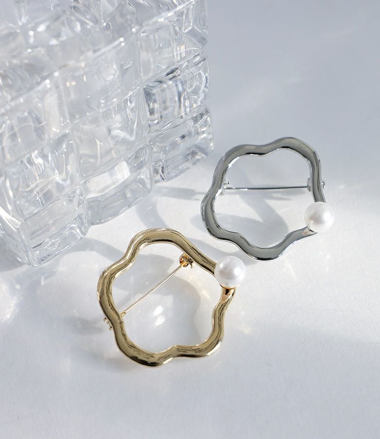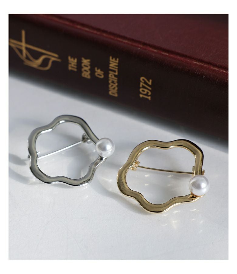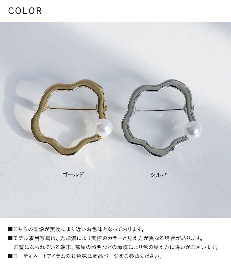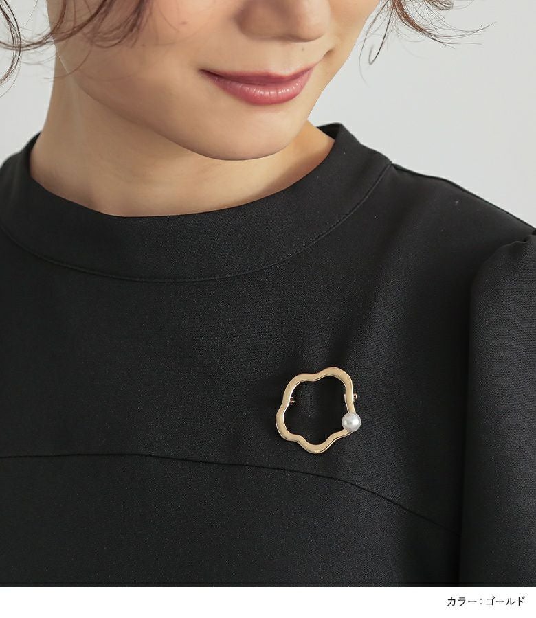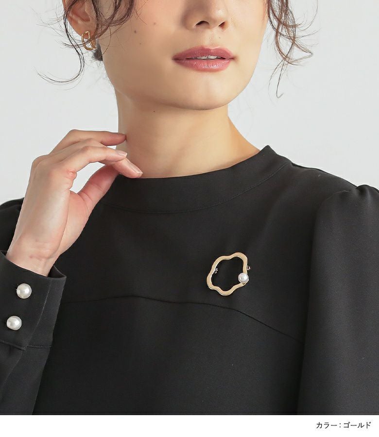 ウェーブサークルに一粒フェイクパールがアクセントのきれいめブローチ。