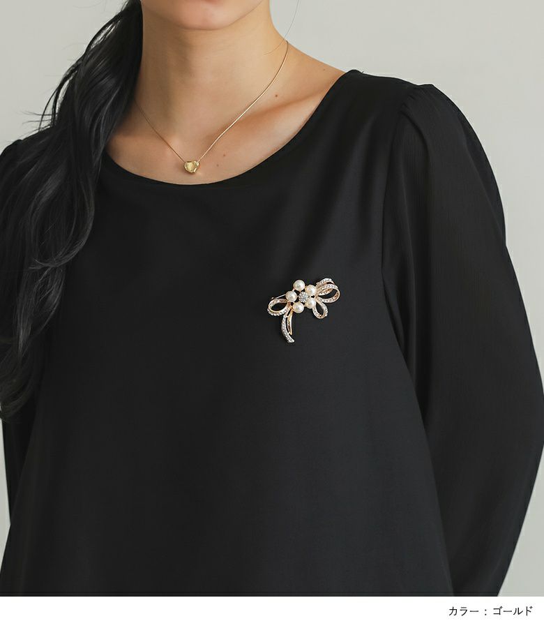 胸元をさりげなく彩るリボンブローチ。