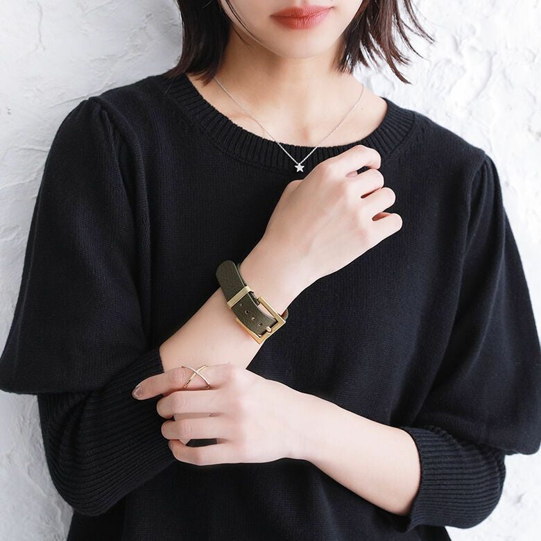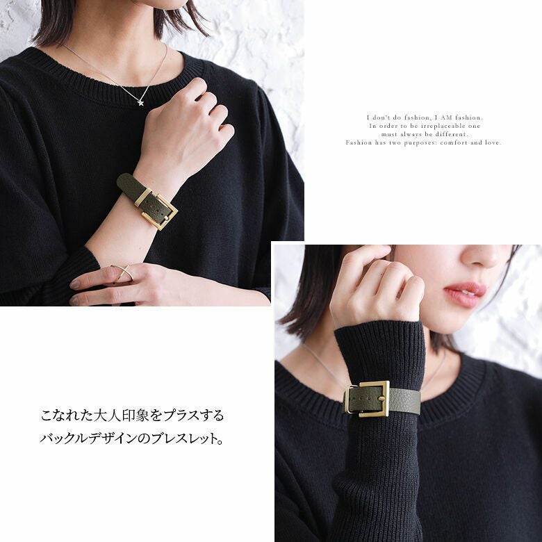 大きめのバックルデザインが手元のアクセントにピッタリ。フェイクレザー素材とメタルパーツの組み合わせが、洗練された印象を放ちます。