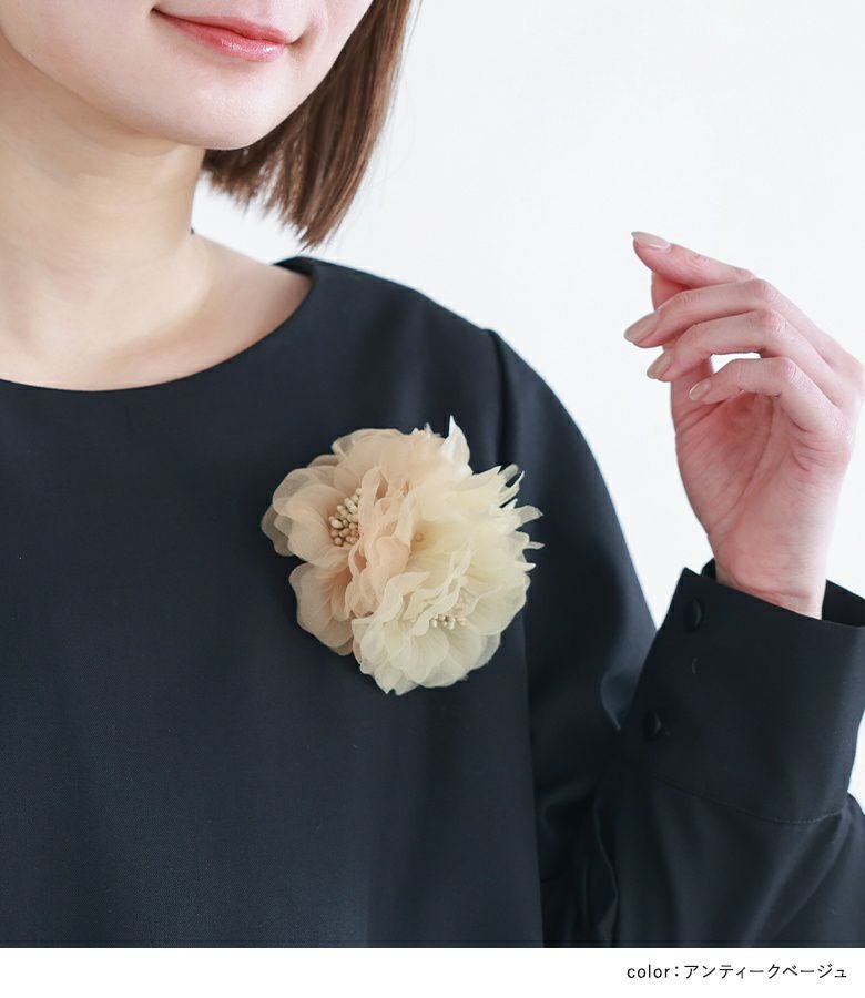 ボリューム感のある配色のフラワーモチーフが、高級感と華やかさを添えるコサージュ。ピンとクリップで留めることが可能なので、コサージュにもヘアアクセサリーにも使えるのが嬉しいポイントです。