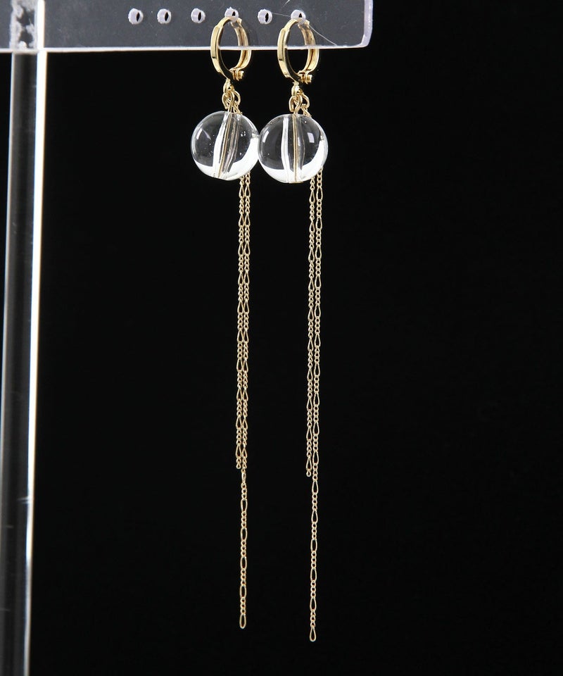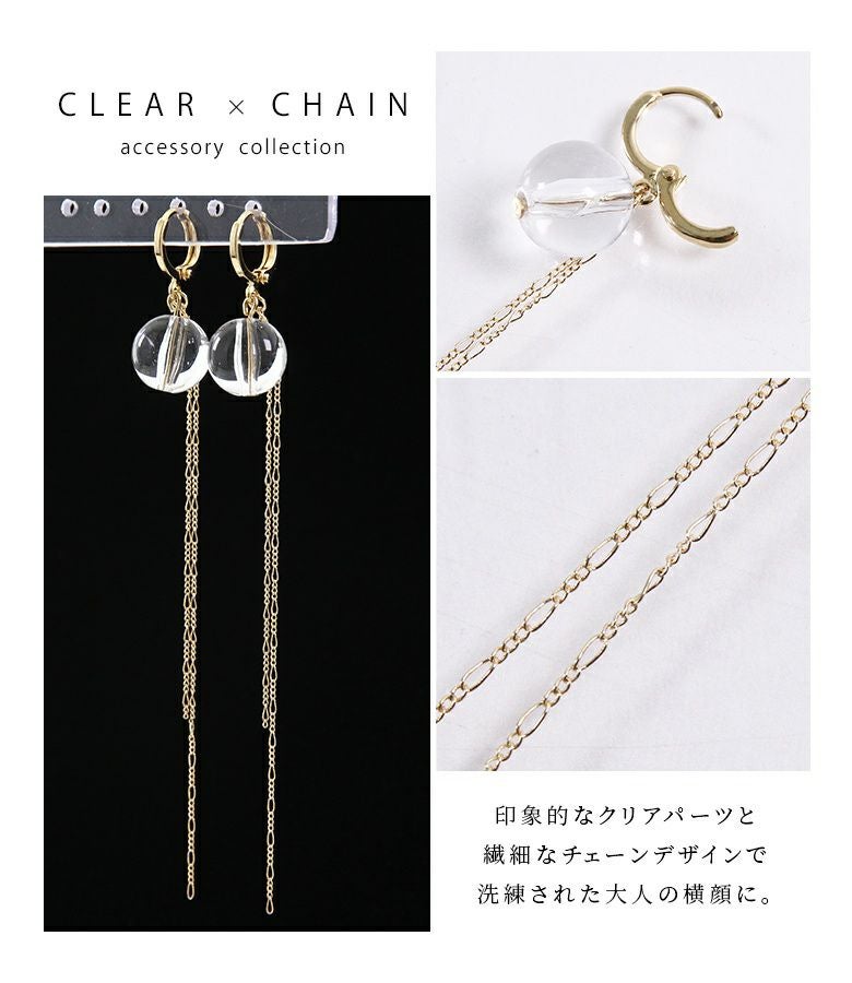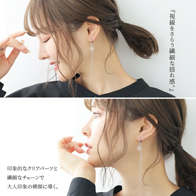 繊細な揺れ感で横顔を飾る、クリア×チェーンロングピアスです。