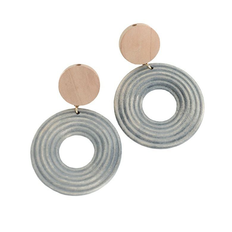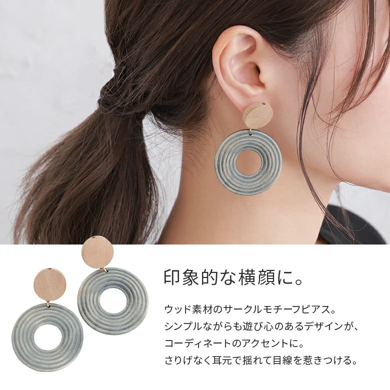 ウッド素材のサークルモチーフピアス。シンプルながらも遊び心のあるデザインが、コーディネートのアクセントに。さりげなく耳元で揺れて目線を惹きつける。