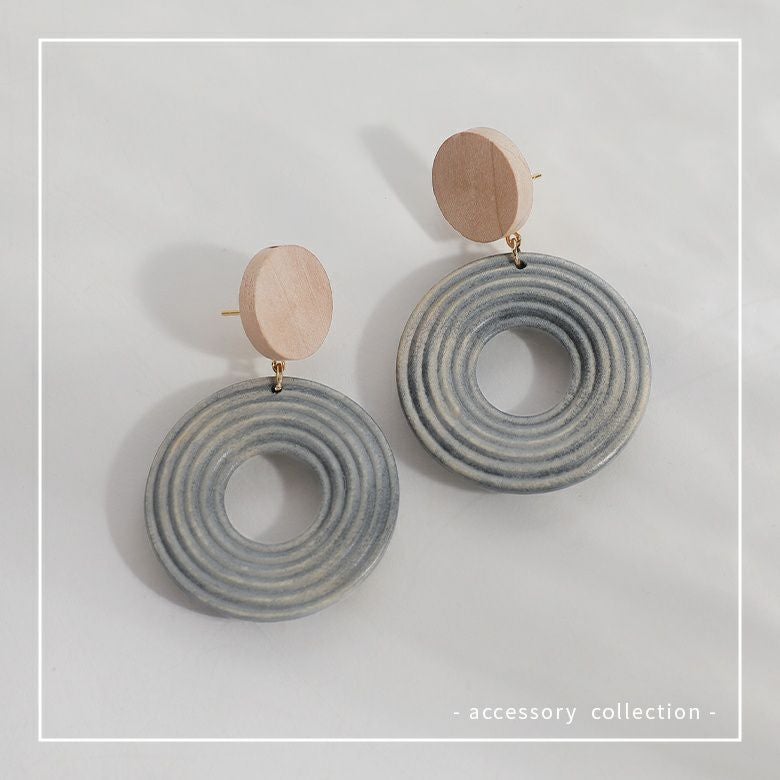 アクリル×ウッドのサークルモチーフピアス。シンプルながらも遊び心のあるデザインが、コーディネートのアクセントに。さりげなく耳元で揺れて目線を惹きつける。
