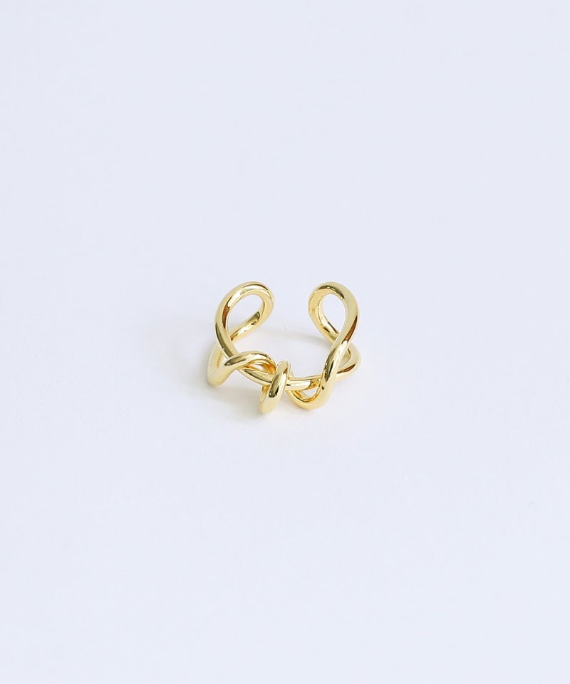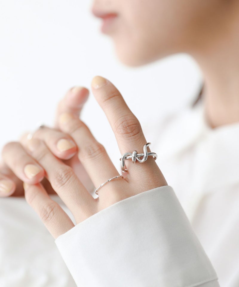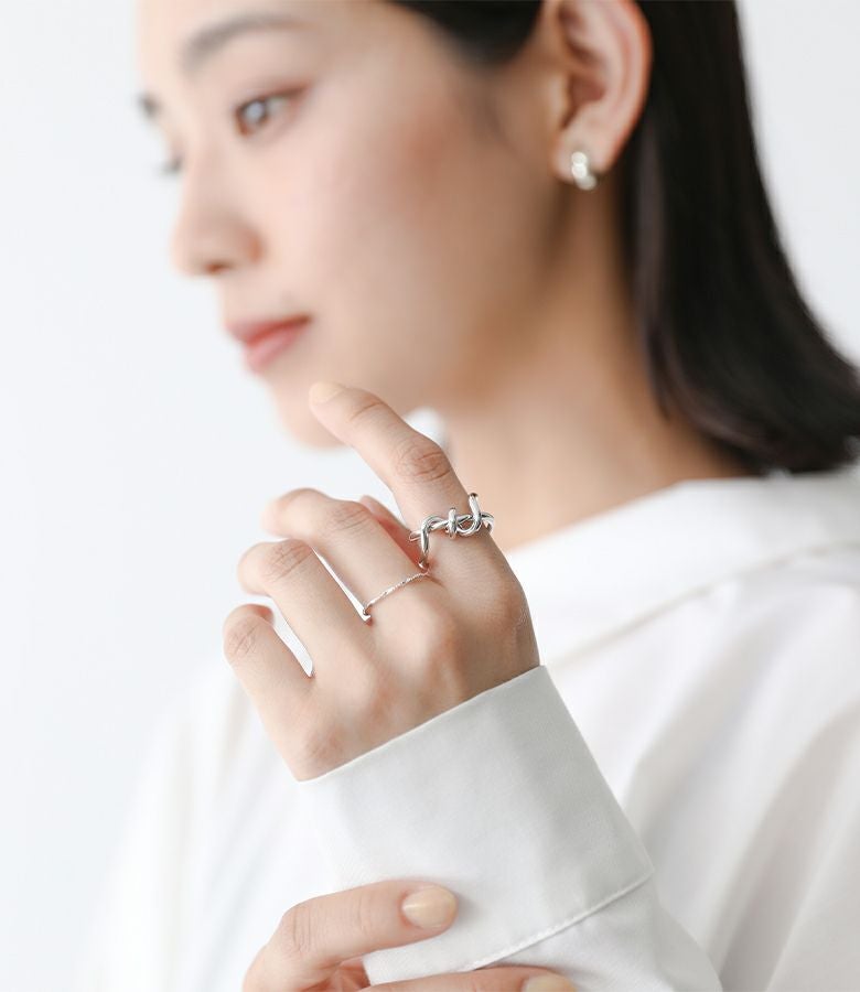 手元のアクセントになるニュアンスラインが、お洒落な印象に仕立てるデザインリング。うねっとした複雑な曲線が、スタイリングにこなれ感をプラスします。