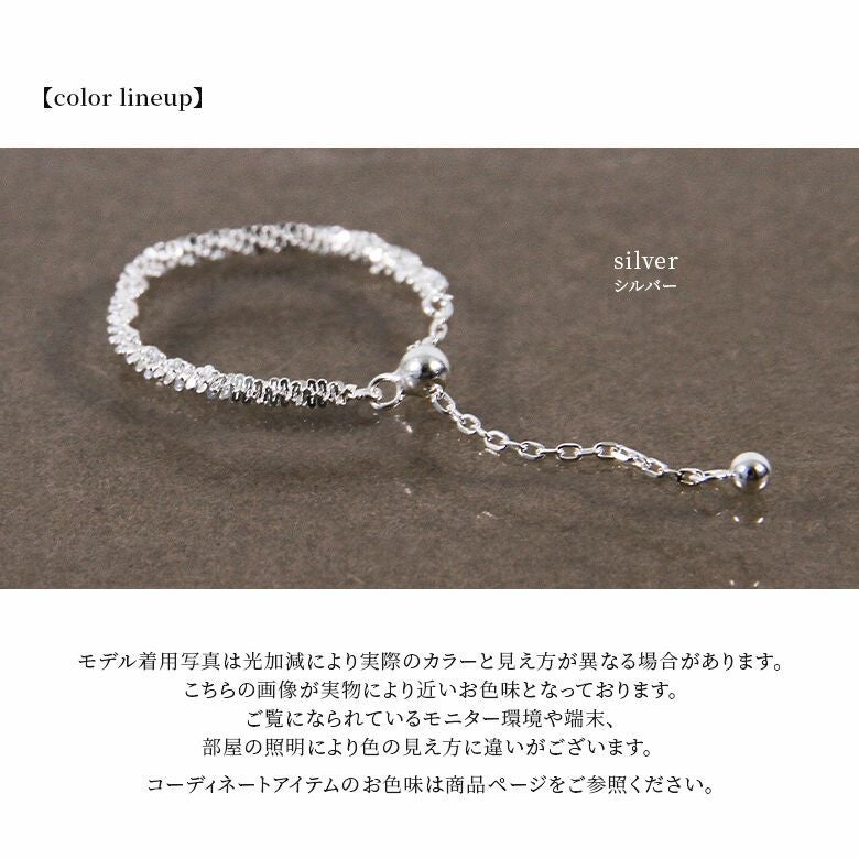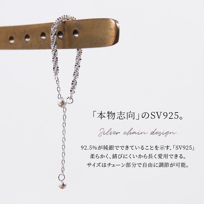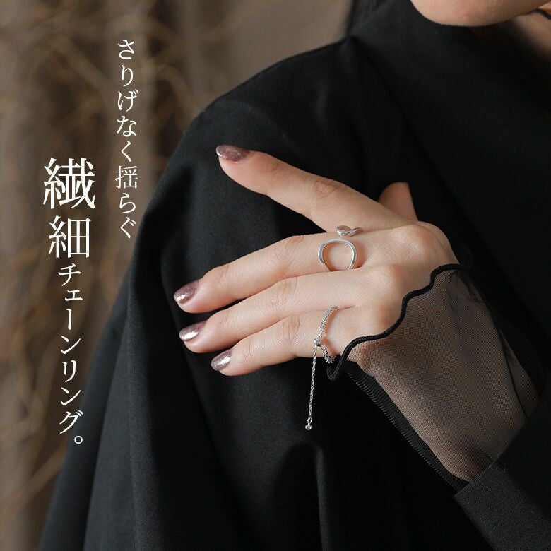 さりげなく揺らぐ繊細チェーンが印象的で、チェーン部分でサイズの調整も可能です。