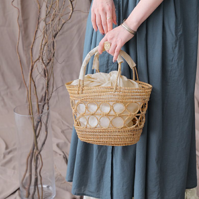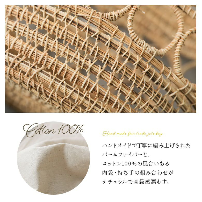 ハンドメイドで丁寧に編み上げられたパームファイバーと、コットン100%の風合いある内袋&持ち手の組み合わせがナチュラルな高級感を漂わせる。