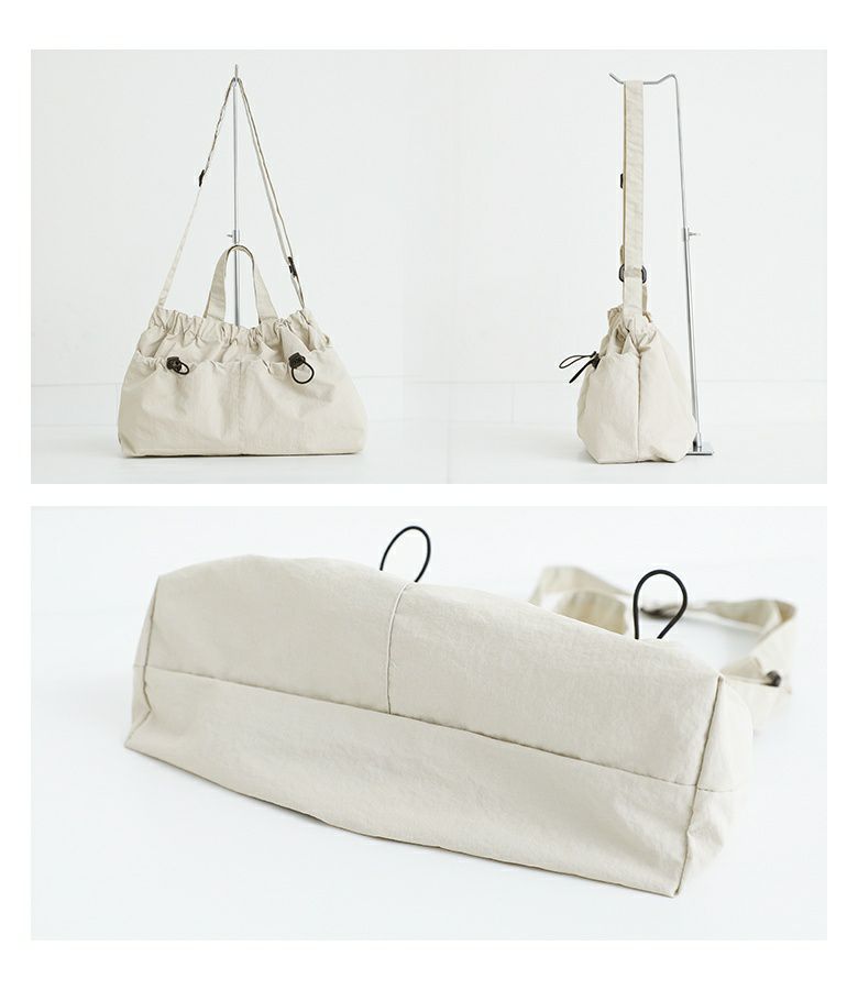 2wayデザインのショルダーバッグ。外側に2つ、内側に1つのポケットがあり、コンパクトなサイズながらドリンクボトルも収納できるサイズです。外側のオープンポケットには自由に調整可能なドローストリングが付いており、コーディネートのアクセントになります。