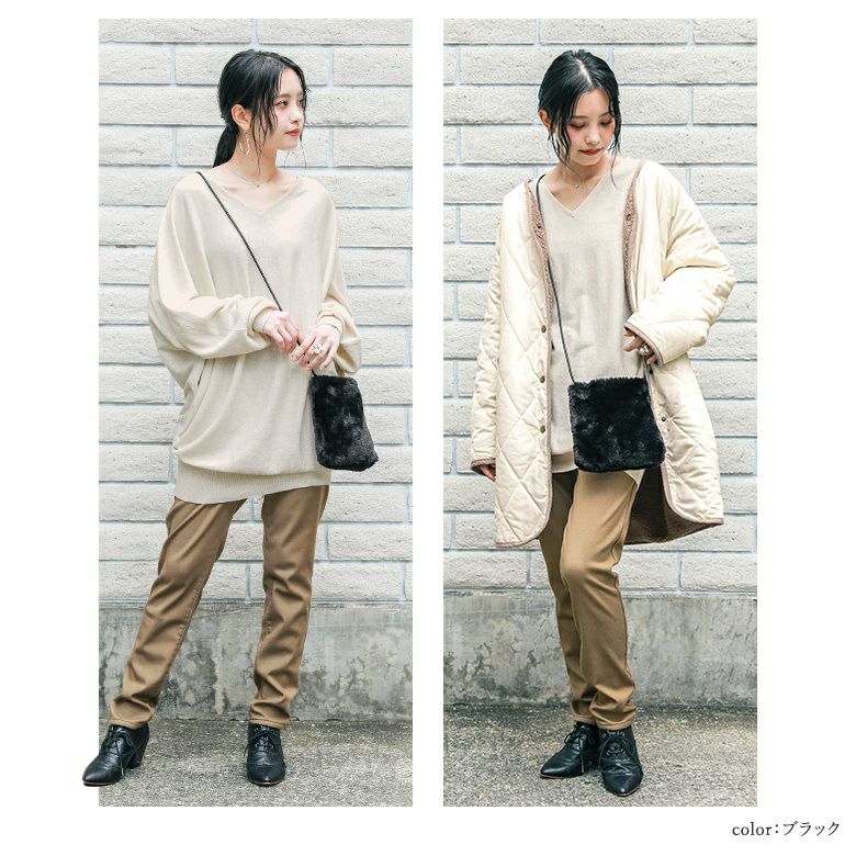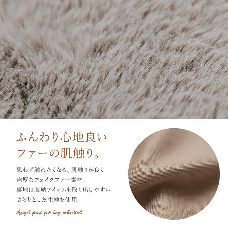 表地の肉厚なファー素材は肌触りが良く季節感も演出。裏地は中のものを取り出しやすいサラッとした生地感です。