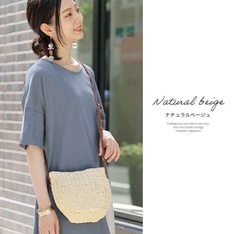 ナチュラルなペーパー素材をしっかり編み上げた、軽くて型崩れしにくい素材感。ショルダー紐はリアルレザー調のPUレザーを使用し、高級感をプラスしました。