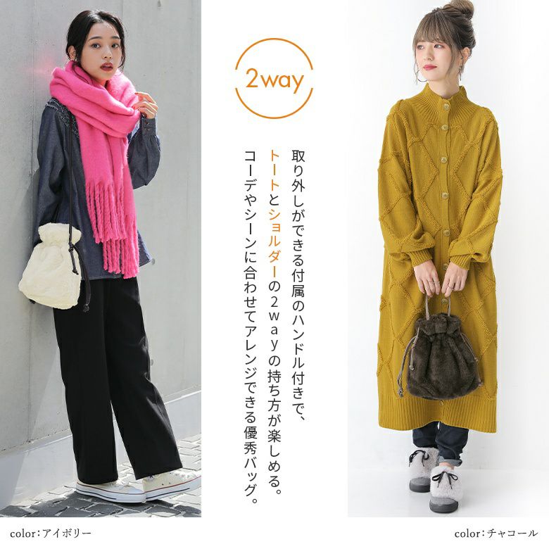 思わず触れたくなるふわふわのフェイクファーは、厚みがあり高級感漂う仕様に。取り外し可能なハンドル付きだから、その日の気分でトートとショルダーの2wayの持ち方が楽しめます。