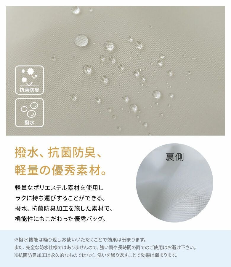 撥水・抗菌防臭加工を施した軽量なポリエステル素材を使用し、機能性にもこだわった優秀バッグ。シンプルなデザインで、様々なコーデに合わせやすいのも嬉しいポイントです。