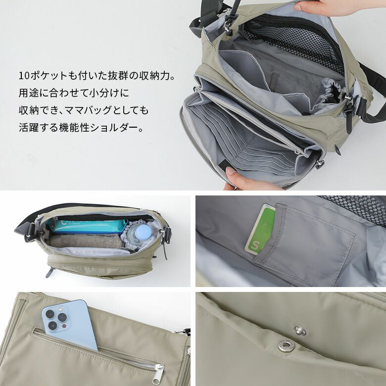 10ポケット付き&拡張可能なマチ付きで、多収納を叶える機能性ショルダーバッグ♪用途に合わせて小分けに収納でき、マザーズバッグとしても活躍します。