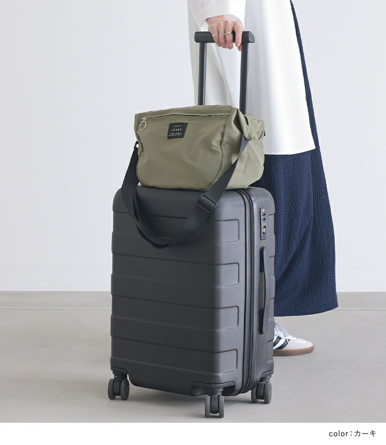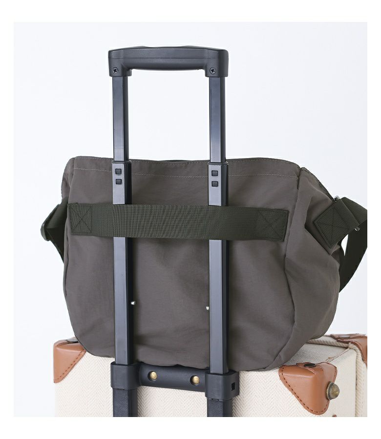 ふわっとした風合いの軽量ショルダーバッグ。広めのマチで、お出かけに必要な荷物がしっかり入る容量です。スーツケースに取り付けられるキャリーオン仕様なのも嬉しいポイント。軽く折りたたんで持ち運べるため、デイリーはもちろん旅行やアウトドアなどでのサブバッグとしても活躍します。