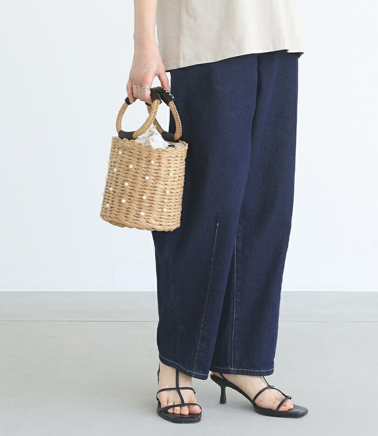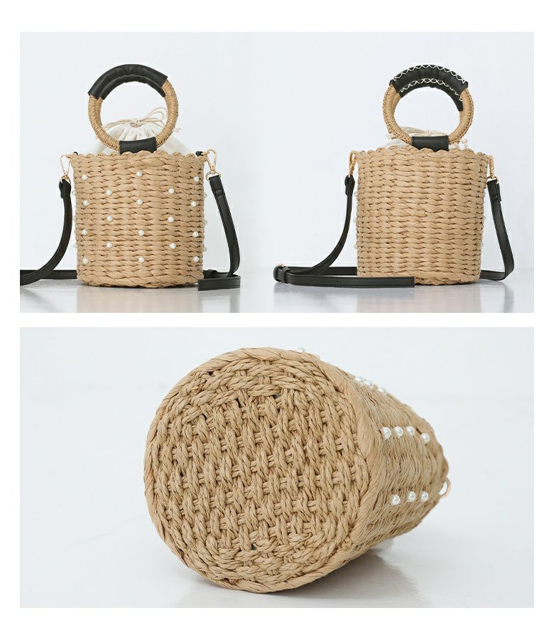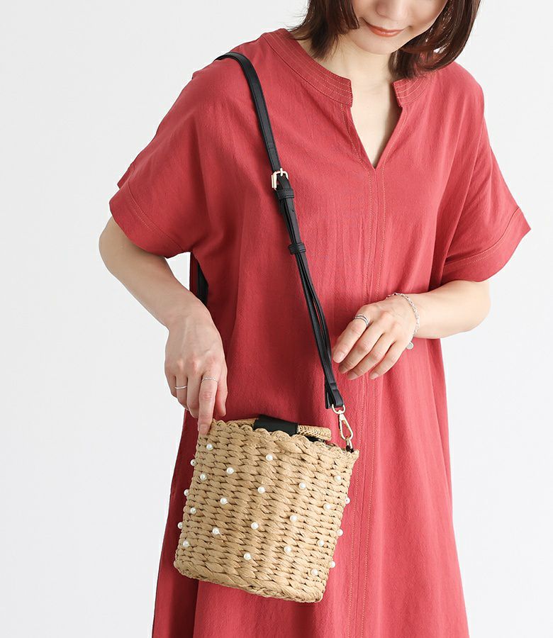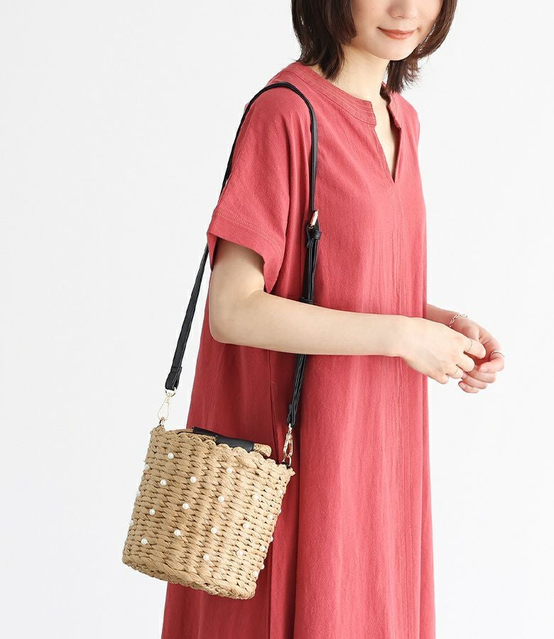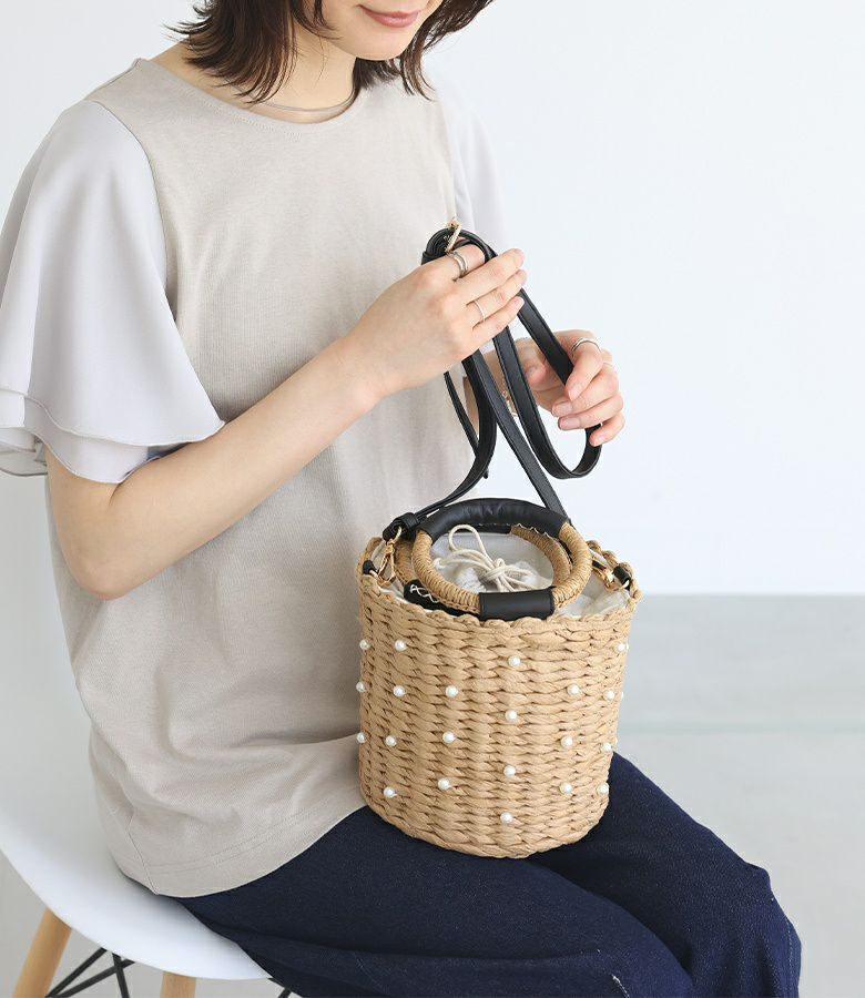 フェイクパール付き2way仕様のバケツ型カゴバッグ。