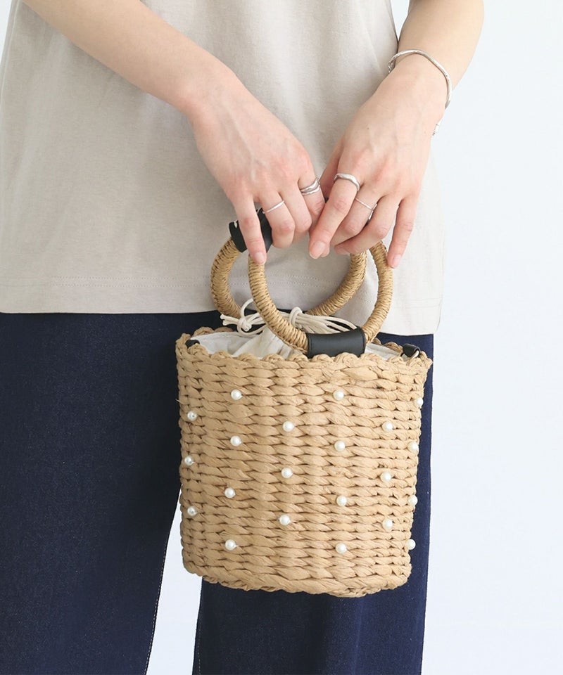 フェイクパール付きのデザインが特別感を出す、2way仕様のバケツ型カゴバッグ。安定感ある丸底で、お出かけに必要な荷物が入るサイズ感です。荷物が取り出しやすく、中身も見えない巾着仕様なのも嬉しいポイント。
