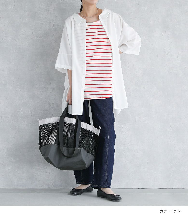 メッシュ素材の2WAYトートバッグ。手持ちにも肩掛けにも対応可能な長さの違う2種類の持ち手付きです。両サイドのボタンを留めれば、コンパクトな印象のフォルムに変形でき、シーンに合わせて使い方をアレンジできます。
