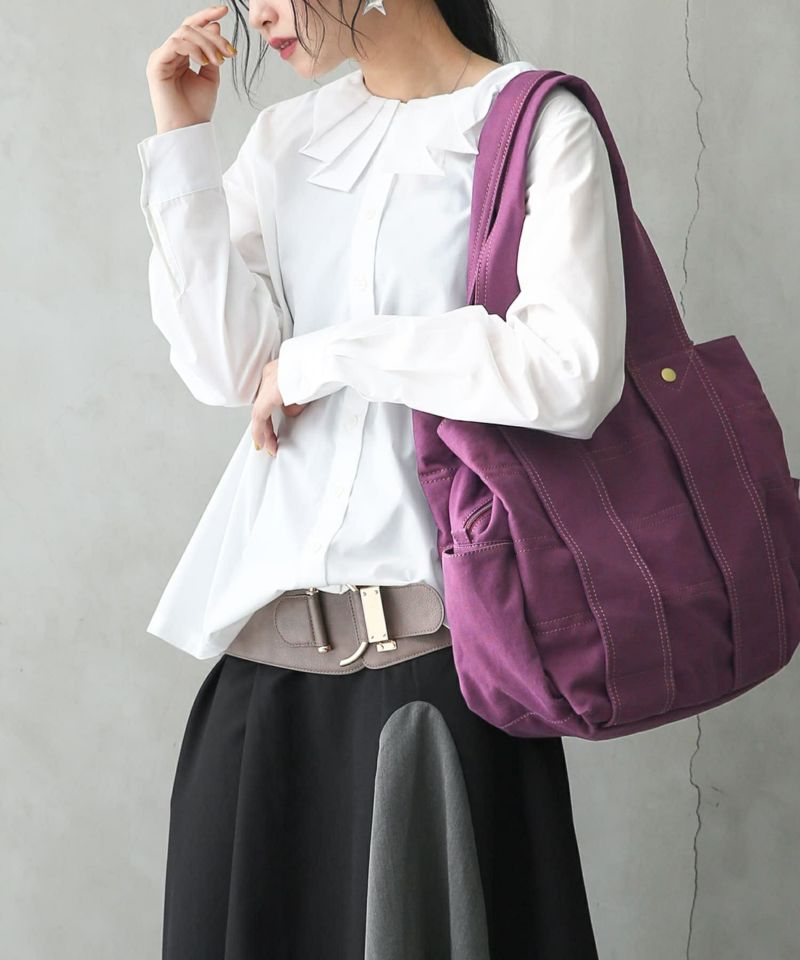 職場にお弁当を持って行くことになりある程度の大きさのバッグを探していました。 ①持ち手がしっかりしているもの ②お弁当箱と水筒を入れてもパンパンにならないもの ③バッグの中に仕切りがあるもの ④キャンパス地であること これが私の希望でしたがなかなか合うものがなく 実は3つ失敗してます(自己嫌悪) で、こちらのバッグを見つけて大きさ等を確認し 購入したのですが、めちゃくちゃいいです!! 持ち手の幅がしっかりあるので肩にかけても 安定感があります。 中も大きな場所とサイドに細かいものが入れられる ポケット、サイドには水筒やキーケースが入るポケット サイドの仕切りにはスマホの入る場所があります。 この大きさだと1泊旅行くらいなら賄えると思います。 色もくすみ系とハッキリ系があるので好みで選べますし 何より大きさが本当に素晴らしい。 大きすぎないので使いやすいです。