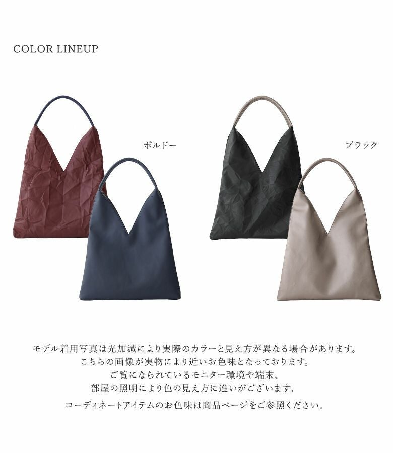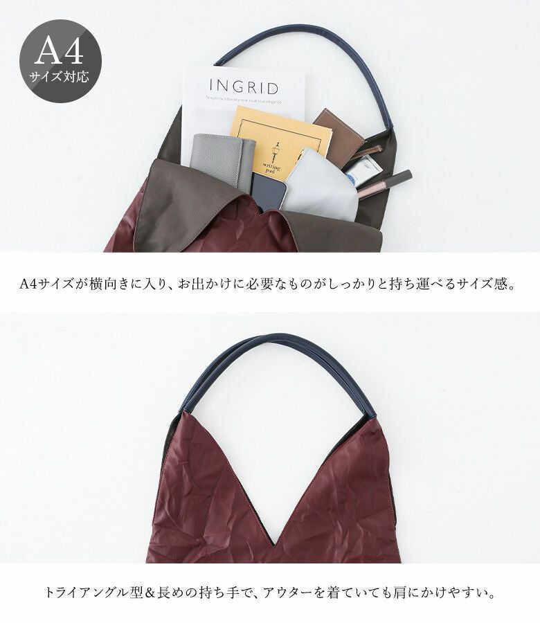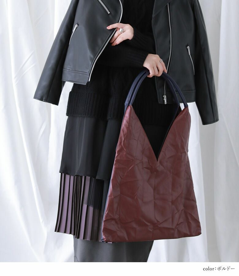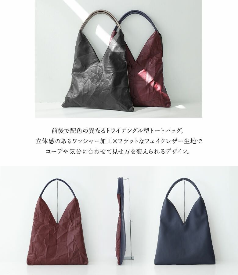前後で配色の異なるトライアングル型トートバッグ。立体感のあるワッシャー加工×フラットなフェイクレザー生地でコーデや気分に合わせて見せ方を変えられるデザイン。