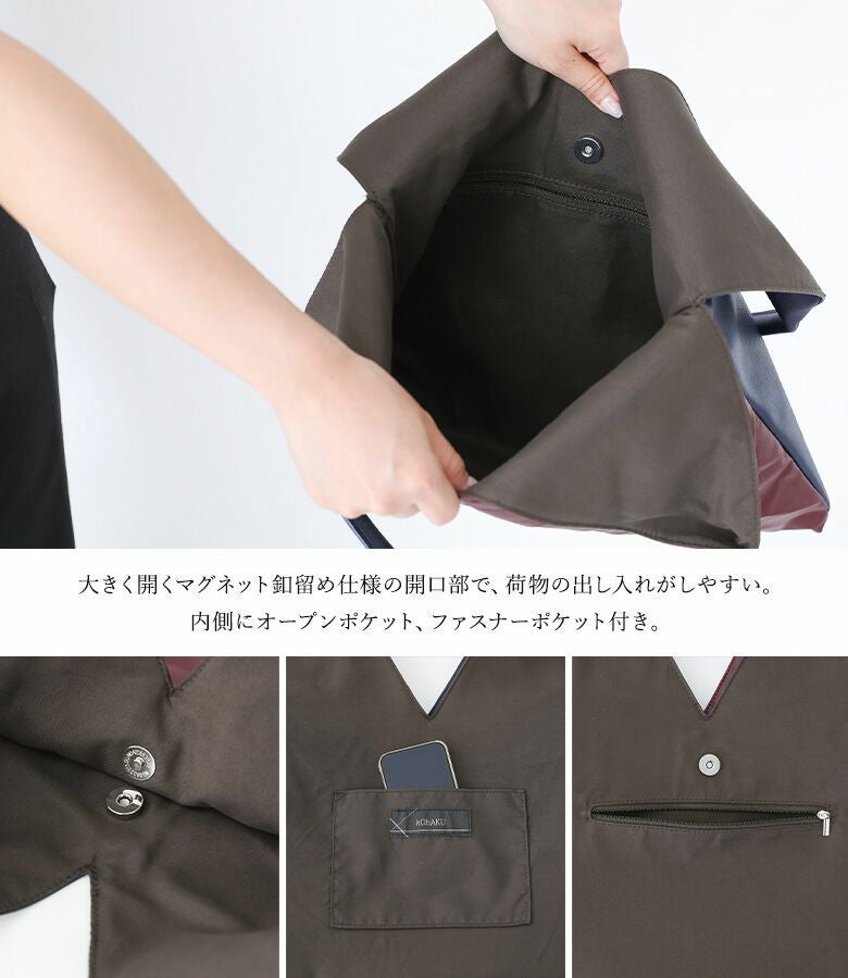 大きく開くマグネット仕様の開口部で、荷物の出し入れがしやすい。内側にオープンポケット、ファスナーポケット付き。