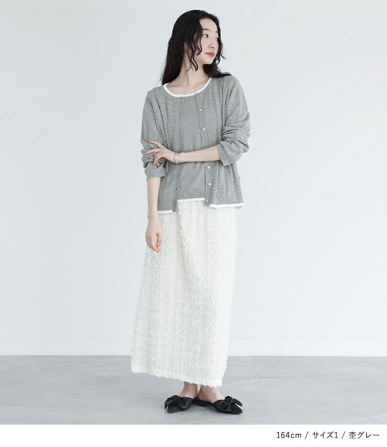 【普段着用】 Tops: L Bottoms: L | 【2】 袖丈(長袖カーディガン):手の甲が隠れる位 袖丈(半袖ニット):ひじ上15cm位 着丈:ヒップ真ん中位 腕周り:ゆったり バスト:ややゆったり 全体:ややゆったり