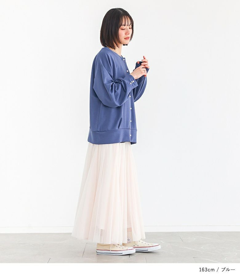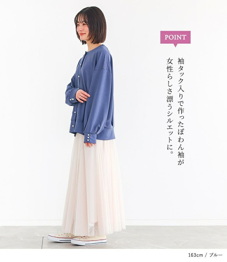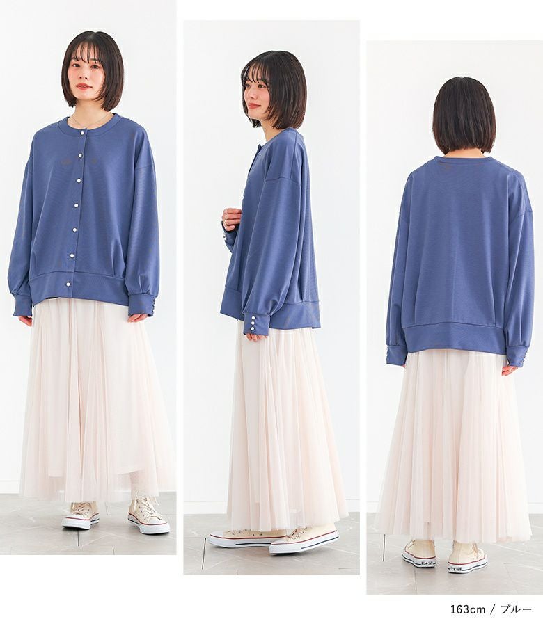 しわになりにくい素材なので、お手入れがとてもラクでした。 フェイクパールボタンがアクセントになり、オフィスやきれいめなシーンにも馴染みそうです。 体のラインを拾いにくく、オンオフ問わず使いやすいカーディガンだと思います。