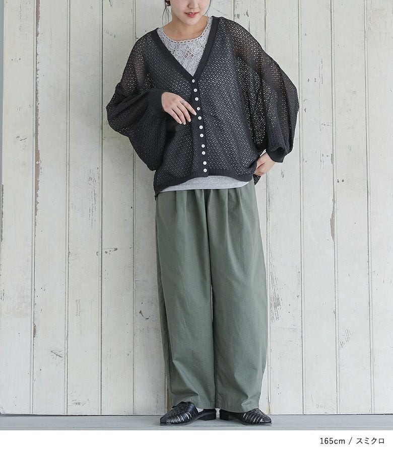 レーヨン混の透かし編み生地を使用。程よい厚みのため、合わせるアイテム次第でロングシーズン着回せるアイテムです。洗える素材で快適にご着用いただけます。