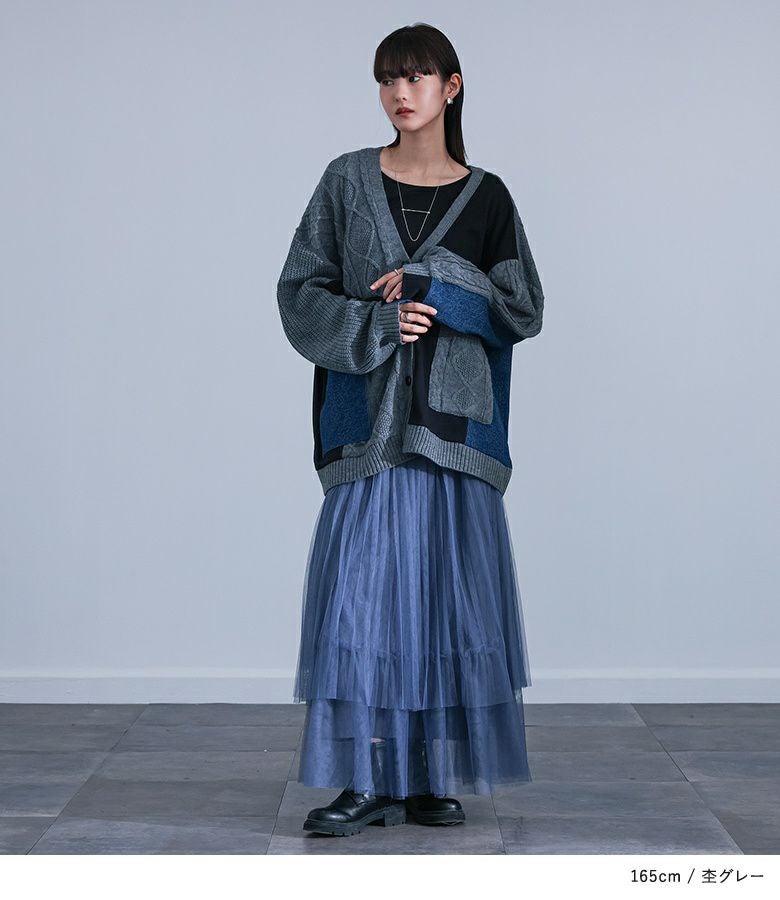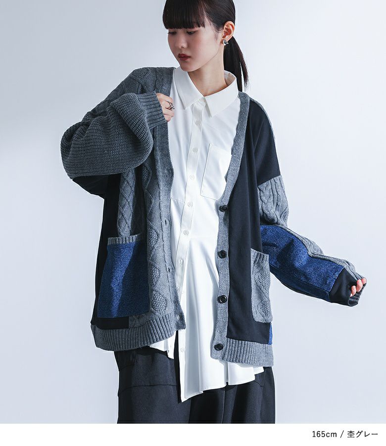 異素材の組み合わせで魅せる、ニットカーディガン。ニット、カットソー、デニムの3種類の生地を大胆に切り替えた、表情豊かな一枚です。メインのニット部分には、前後とも立体的なケーブル編みを施し、豊かな風合いをプラス。左袖はケーブル編み、右袖は縦のラインが特徴の畦編みに。ポケットも左右段差を付けてアシンメトリーなデザインになっています。