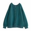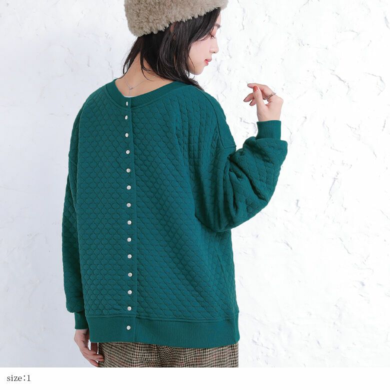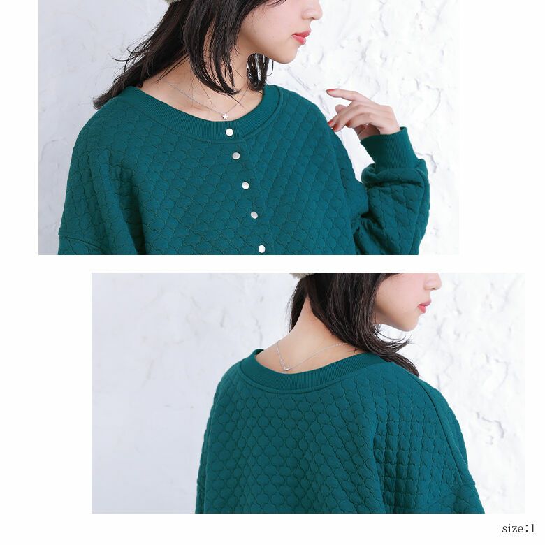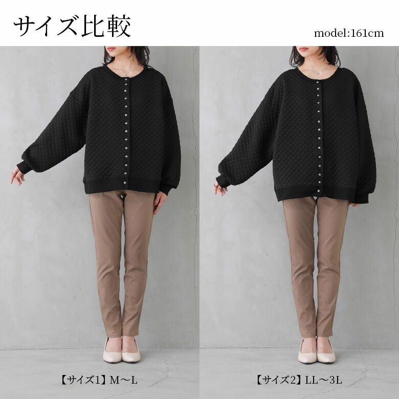襟元はすっきりとしたクルーネックで、前開きのシルバーボタンがお洒落なアクセントに。お好きなシルエットが選べるM~3Lサイズ展開も嬉しいポイントです♪