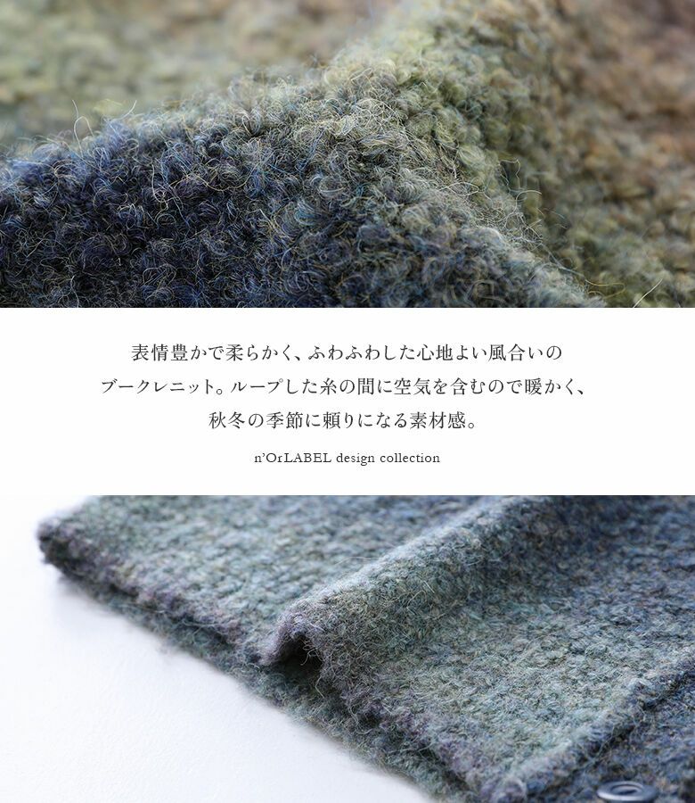 表情豊かで柔らかく、ふわふわした心地良い風合いのブークレニット。ループした糸の間に空気を含むので暖かく、寒い季節の頼りになる素材感です。