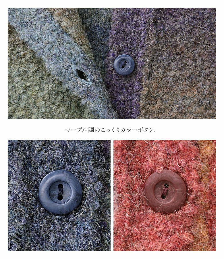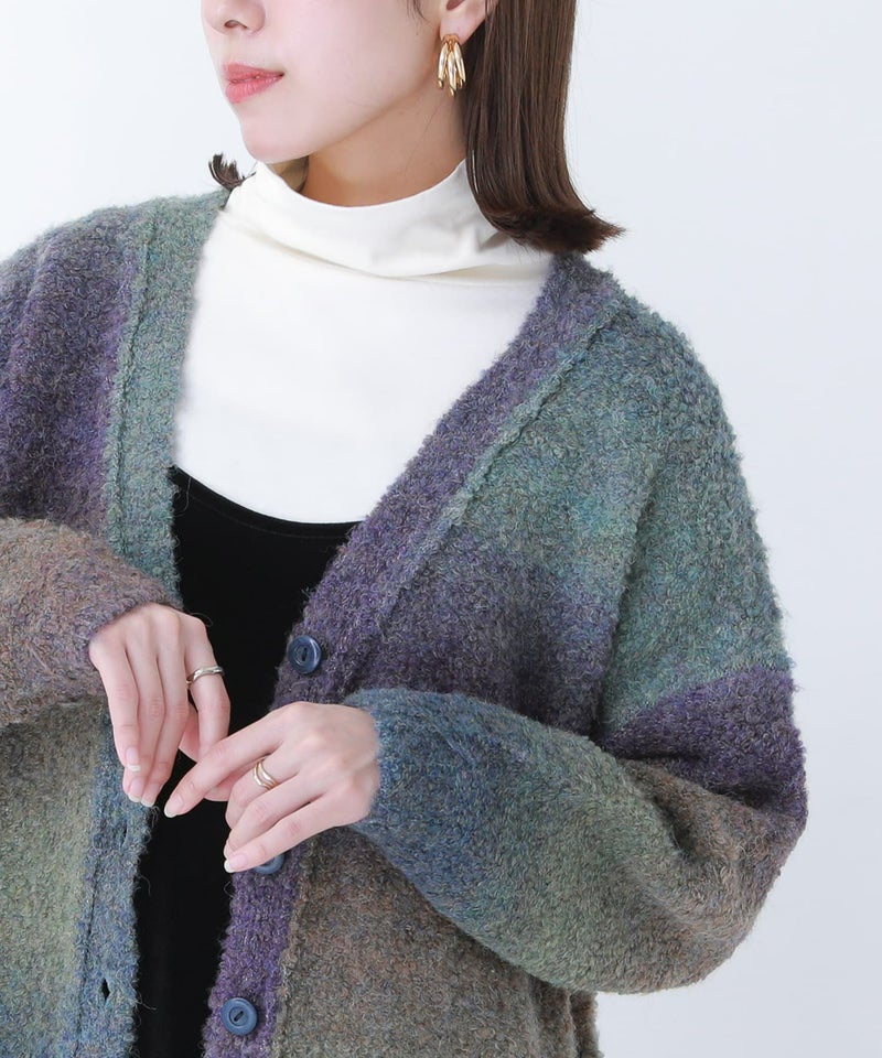 ランダムなグラデーションと、もこもこしたブークレニットが旬なコーデに仕立ててくれるあったかカーディガン。アウトリンキングの前立てデザインが差のつくポイント。深めのVネックと、ゆるっと着られるシルエットで抜け感のあるお洒落を叶えます。