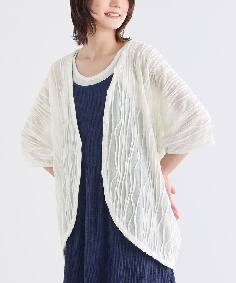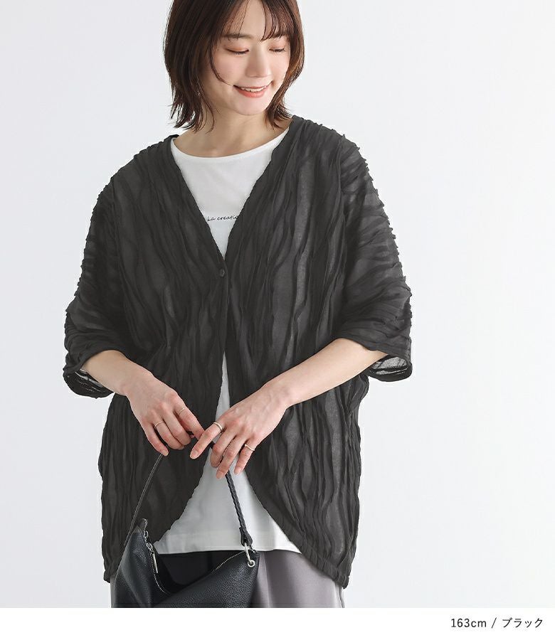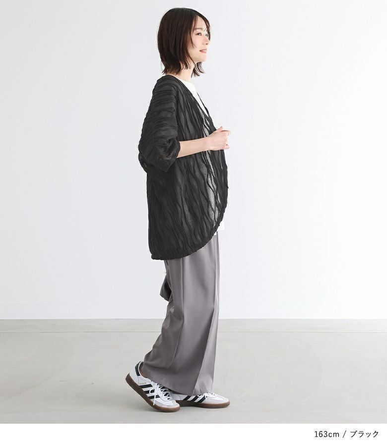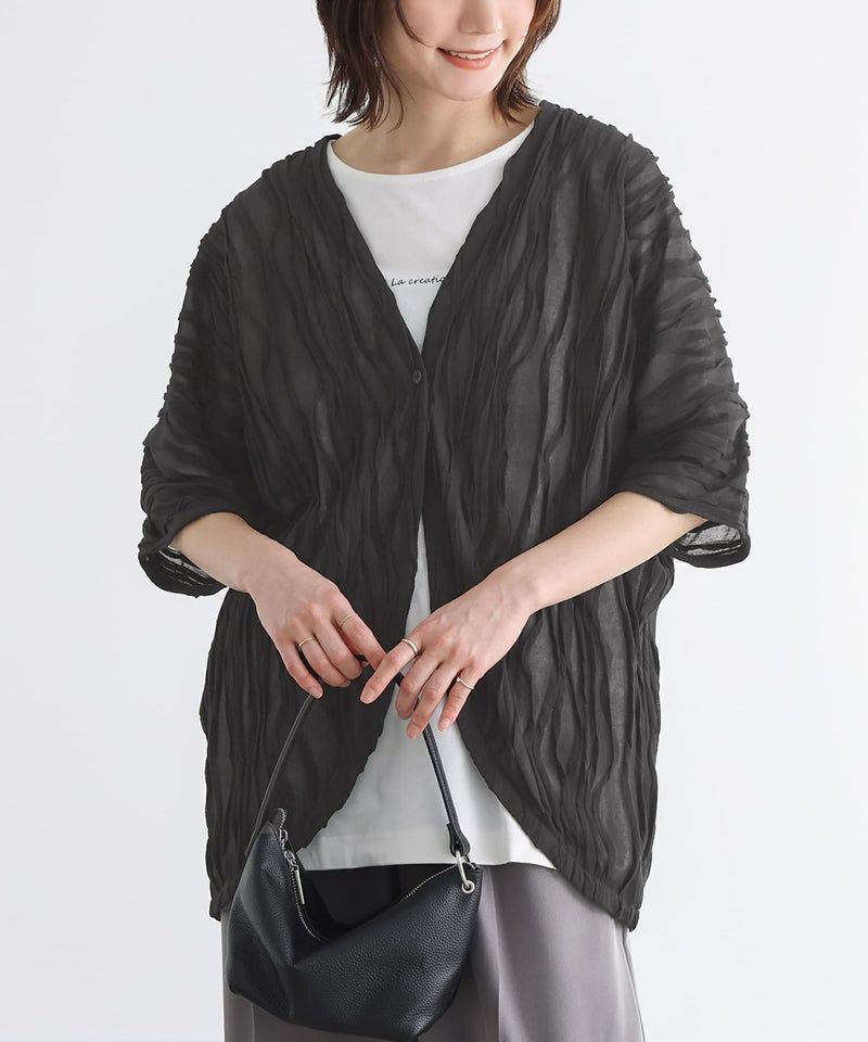 表面感のある生地で、シンプルなアイテムに合わせても表情豊かなスタイリングに。季節の変わり目にさっと羽織ってサマ見えする一枚です。