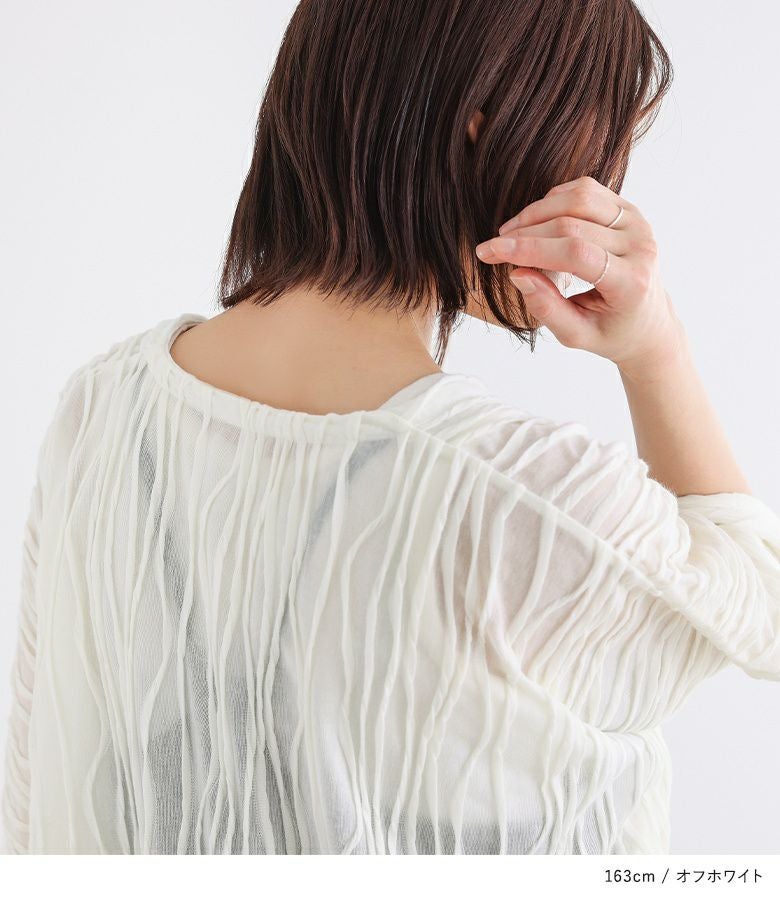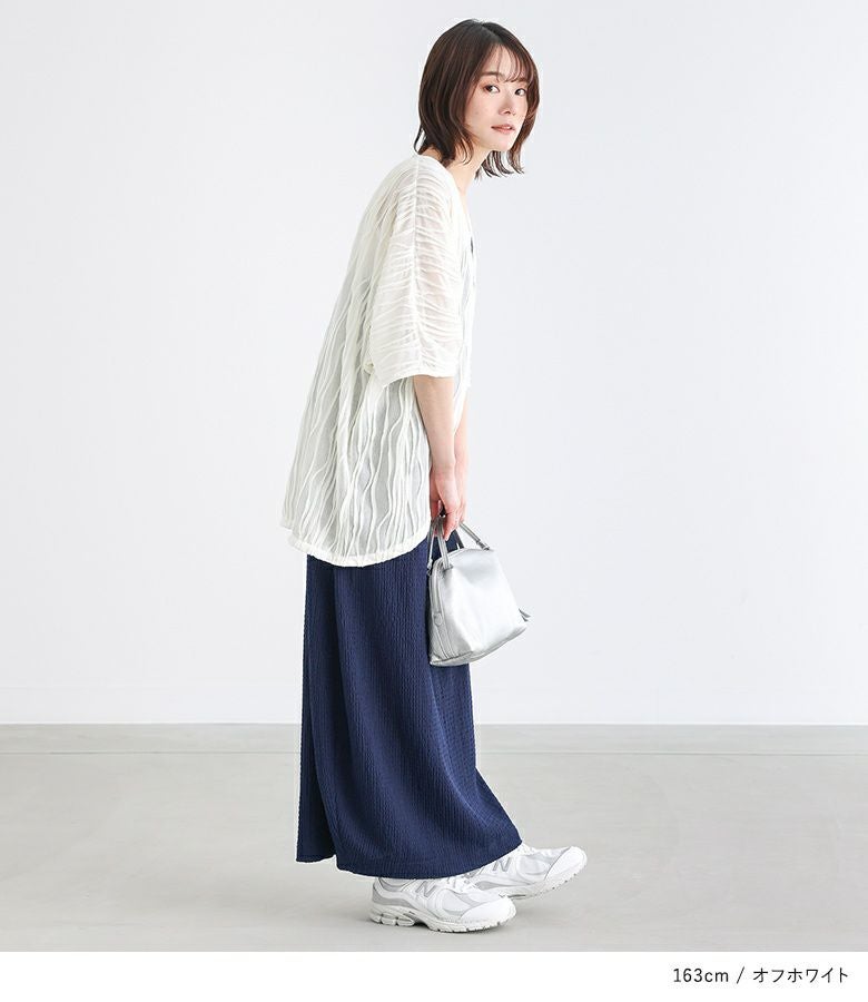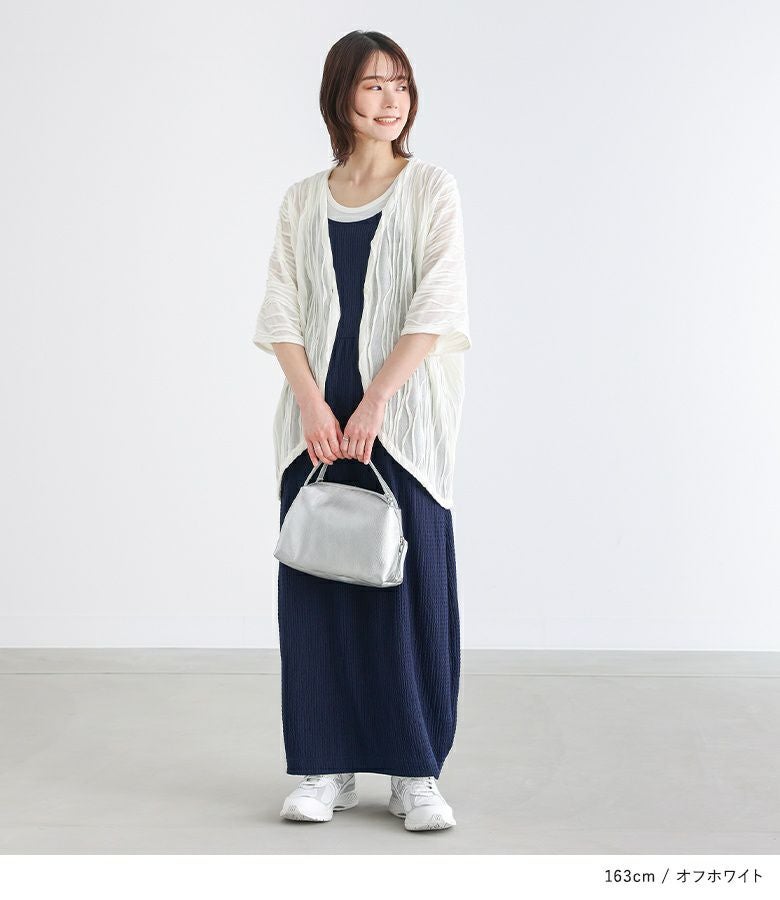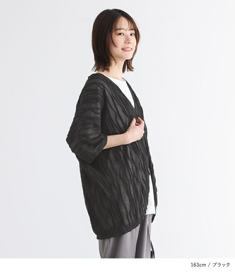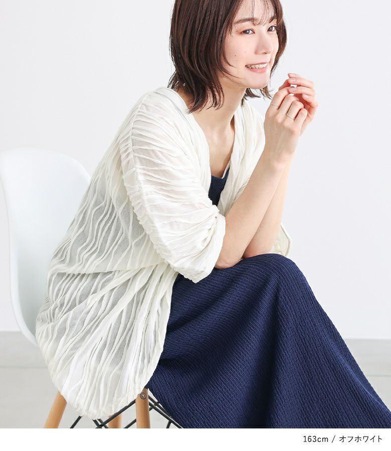 表面感のある生地で、シンプルなアイテムに合わせても表情豊かなスタイリングに。季節の変わり目にさっと羽織ってサマ見えする一枚です。