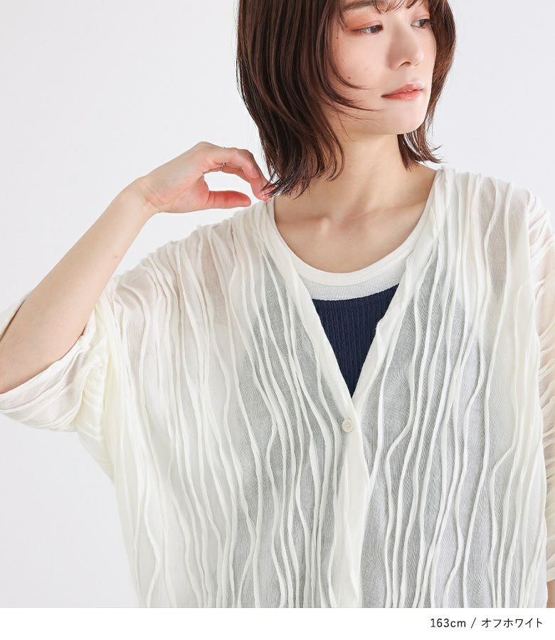 立体感のある変形ストライプ柄がお洒落なシアードルマンカーディガン。ゆるっとしたドルマンシルエットで、羽織るだけでこなれ感の出るアイテムです。お尻も程良くカバーする丈感が嬉しい一枚。