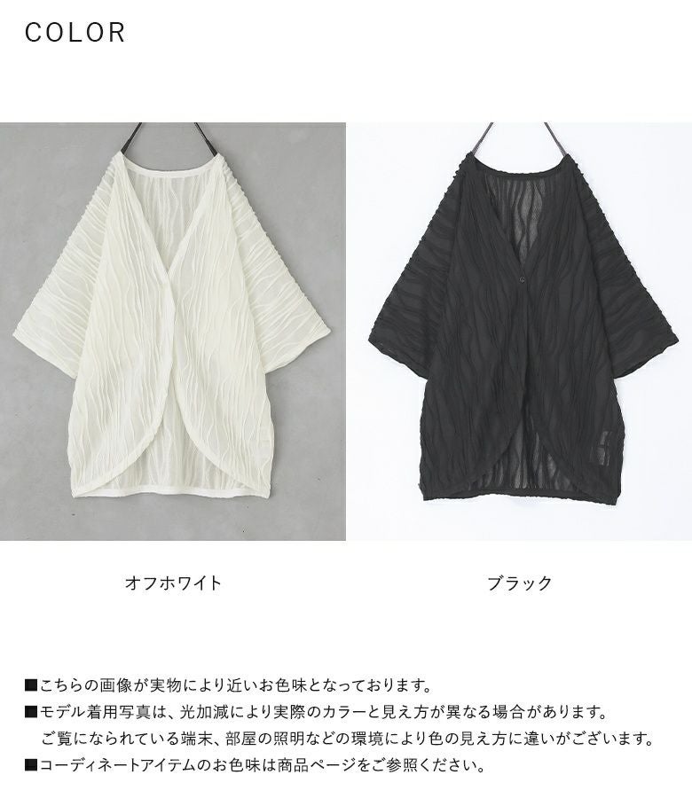 オフホワイト購入。ガーゼ感の肌触りで◎。袖の長さは、肘も隠れ7、8分丈位で丁度よい。 しいて言うならボタンが大きいとありがたいかな。 面倒だから、ボタンしたまま脱ぎ着してます。