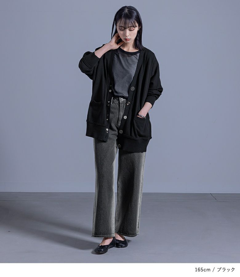ボタンデザインが効いたモードな印象のカーディガン。ボタンホールの間にフェイクボタンを配置し、着脱もしやすい仕様です。袖と裾の切り替えはニットの特性を生かしたくるんとしたデザインに。ゆるっとしたシルエットでラフに羽織れる一着です。