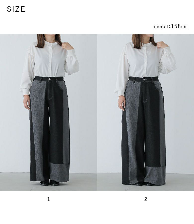 【普段着用】 Tops: M Bottoms: M/L | 【1】 着丈(ウエスト穿き):かかと位 ウエスト:ややゆったり ヒップ:ややゆったり 太もも周り:ゆったり 全体:ややゆったり