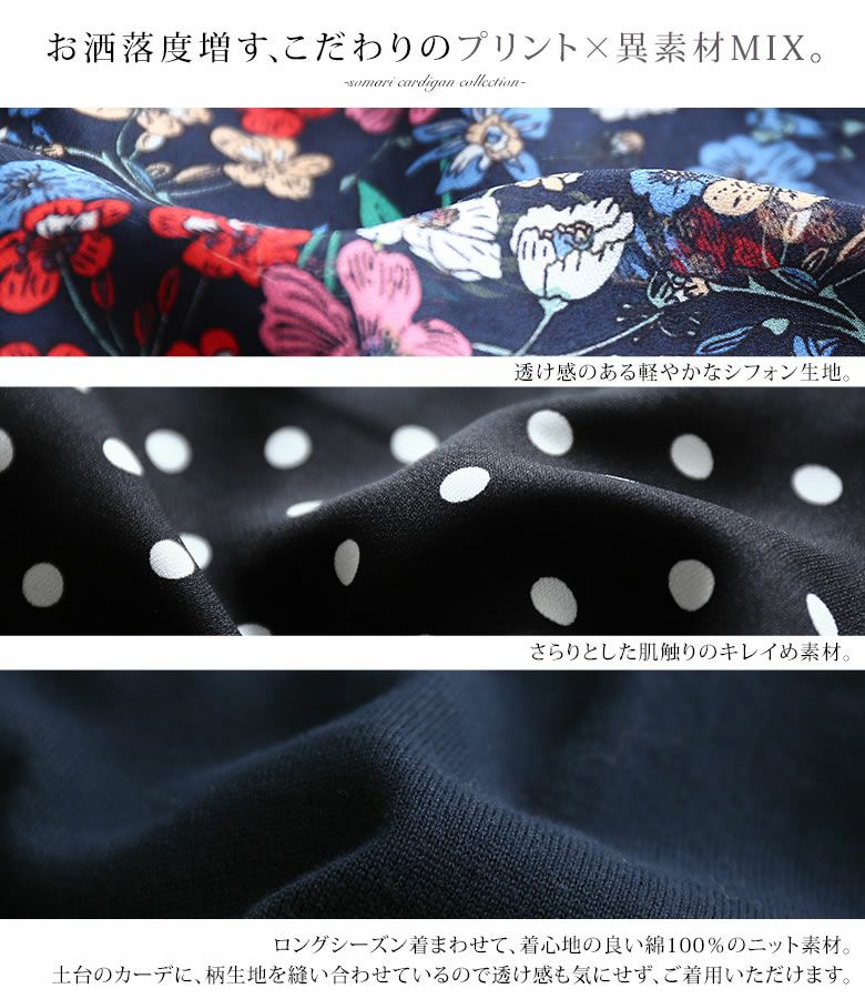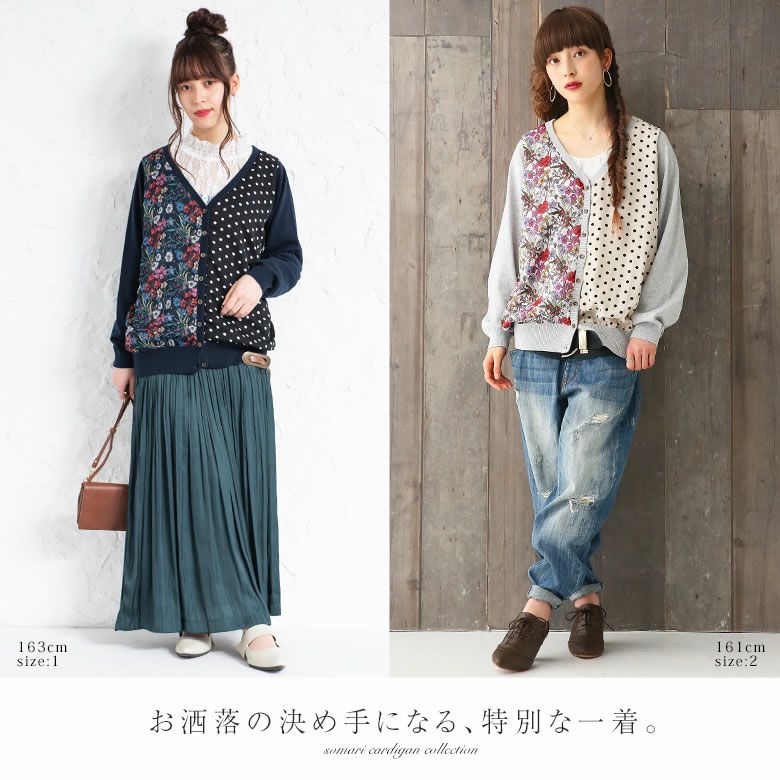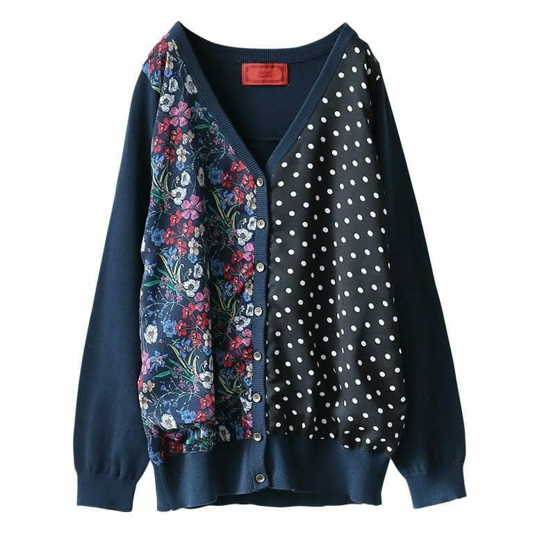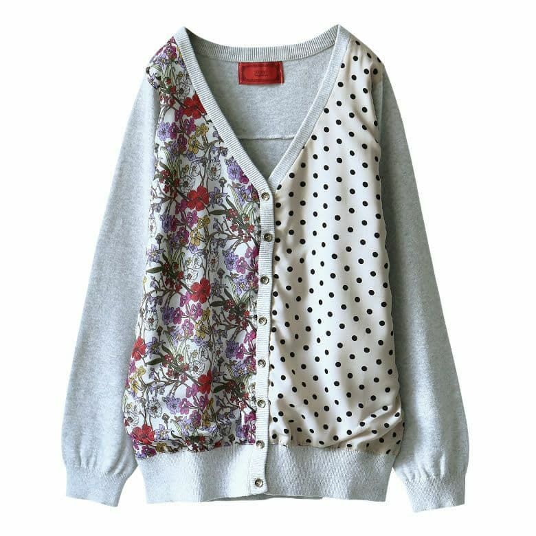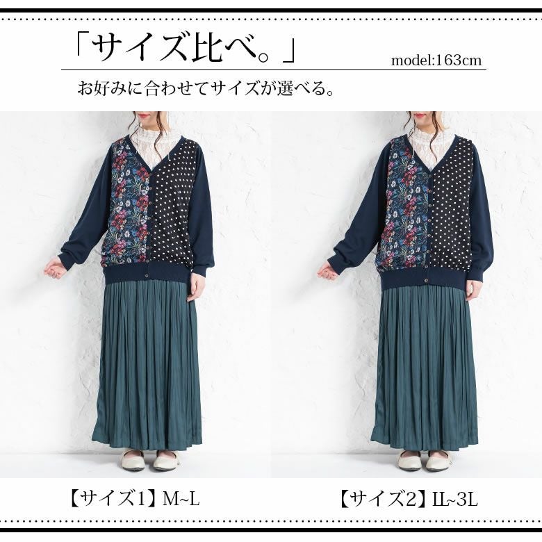 花柄とドット柄を左右で切り替えたニットカーディガンは、羽織るだけで主役級の存在感を放つ。嬉しいM~3Lサイズ展開でお好みのシルエットもお選びいただけます。