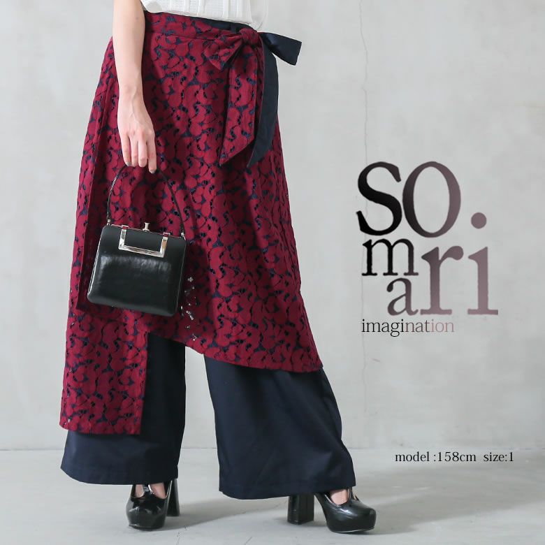 お洒落気分を上昇させてくれる≪somari imagination≫配色レース巻きスカート風ワイドパンツです。