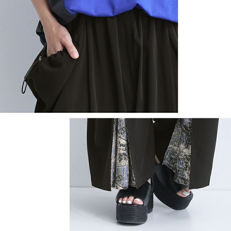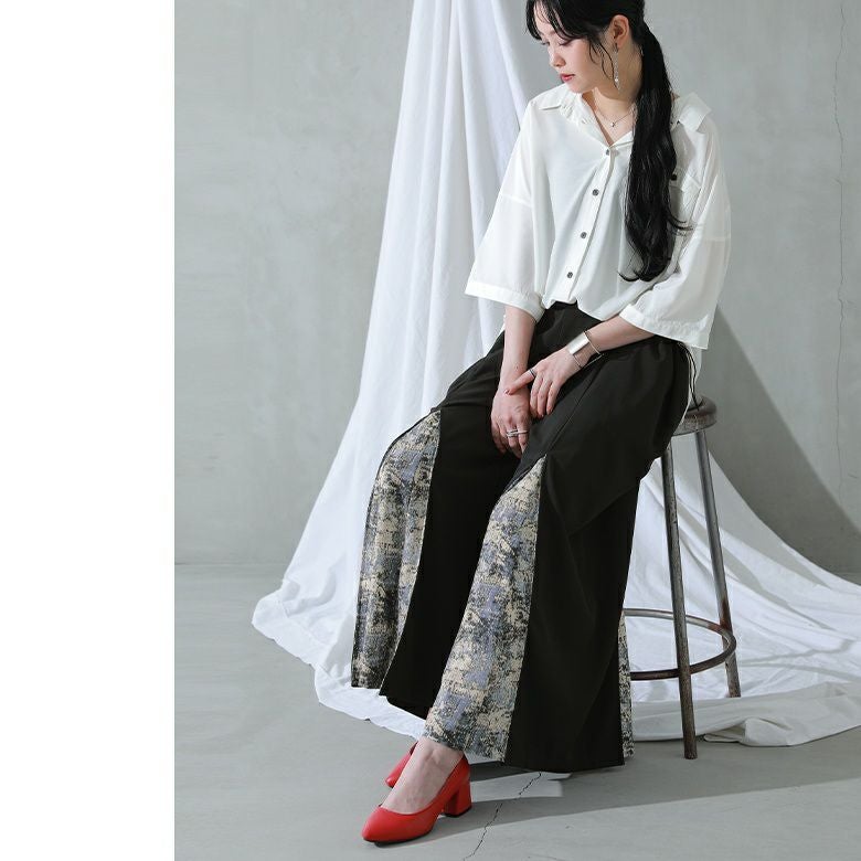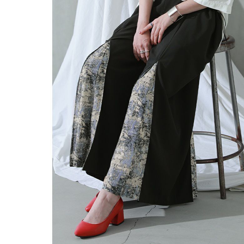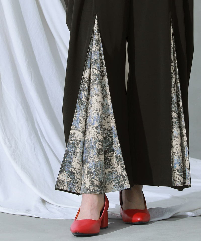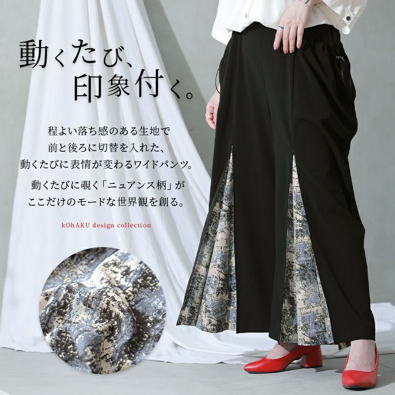動くたびに覗く“ニュアンス柄”がここだけのモードな世界観を創るワイドパンツ。