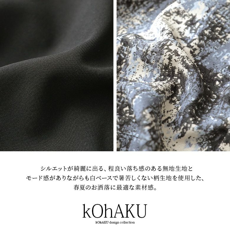 シルエットが綺麗に出る、程よい落ち感のある無地生地とモード感がありながらも白ベースで暑苦しくない生地を使用。これからの季節のお洒落に最適な素材感。