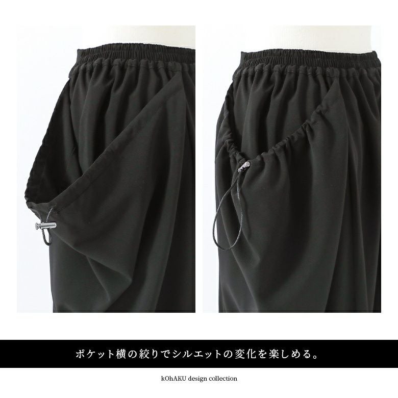 程よい落ち感のある生地で前と後ろに切り替えが入っているから、動くたびに表情が変化する。ポケット横の絞りでシルエットの変化も楽しめるから、360度目を惹くデザイン性です。
