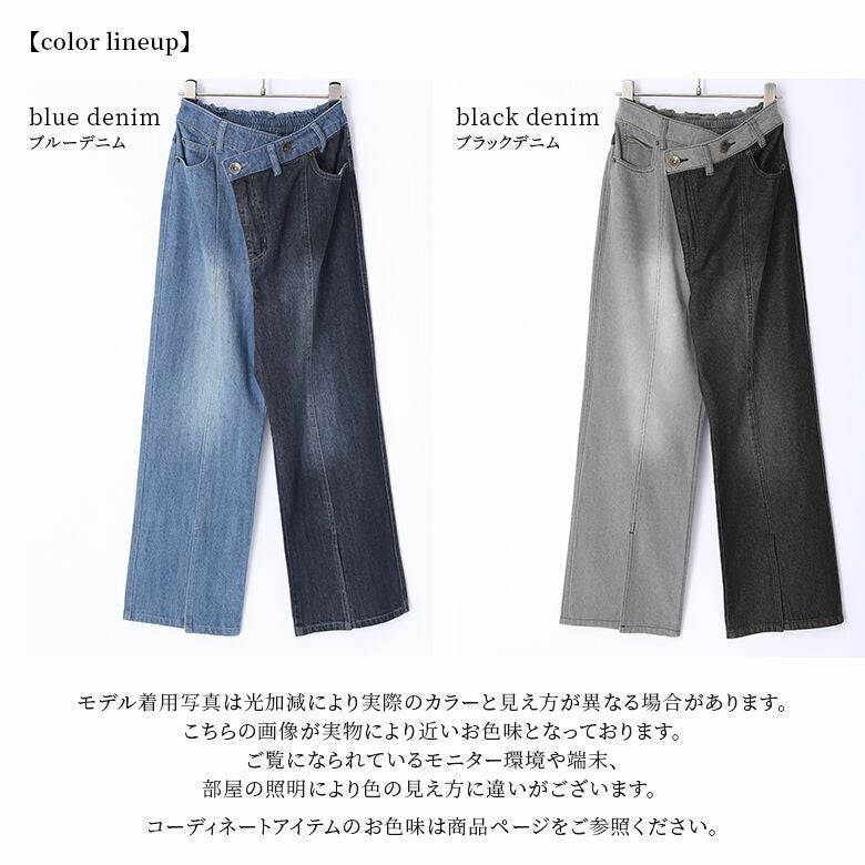 インパクトがありながらも使いやすい配色のアシメデニムパンツ。