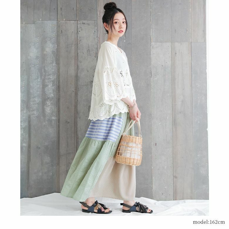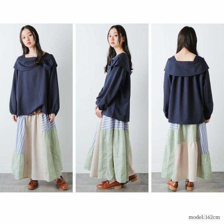 存在感のあるたっぷりのフレアシルエットが気分を上げる。ベージュストライプ×サックスマルチストライプ×ギンガムチェックの異素材をミックス。どの向きでも着用できるマルチウェイだから、気分に合わせて印象チェンジ!こだわりの柄使いで、360度異なる表情に思わず視線を奪われる一枚です。