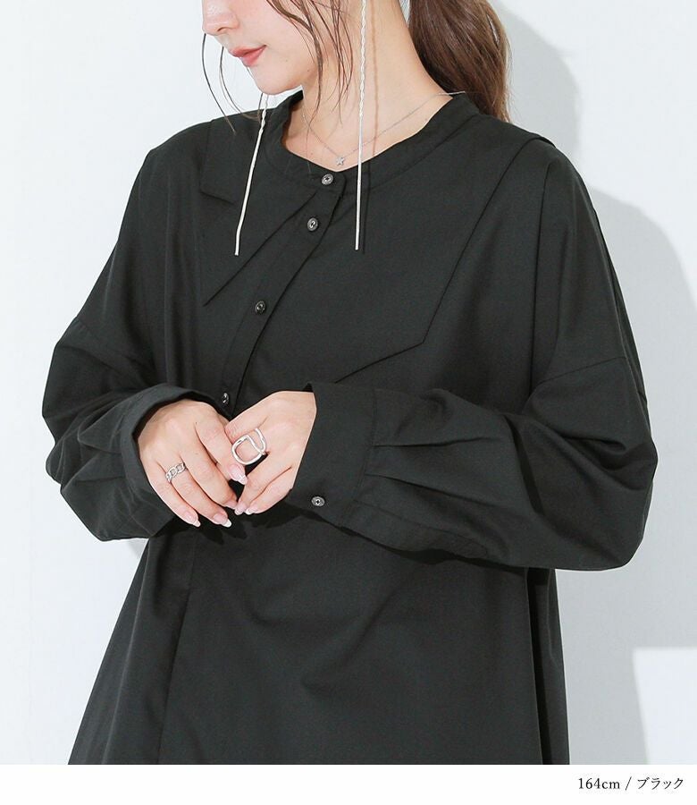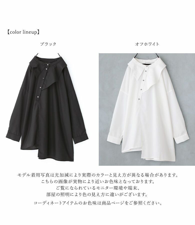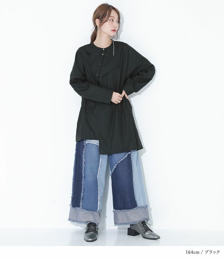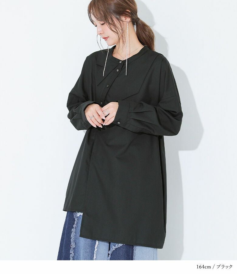 左右でカタチの異なる襟と裾デザインが特徴的なデザインシャツ。ラフに着られるゆるっとシルエットが絶妙なバランスで、他にはない特別感が高まります。