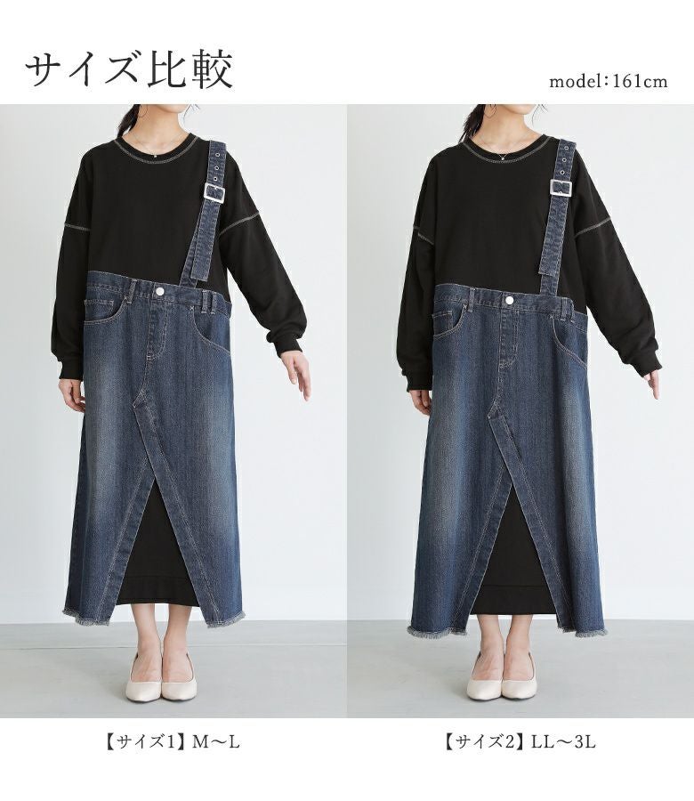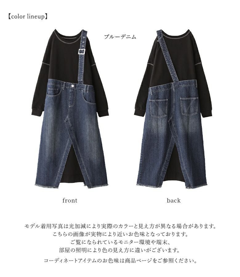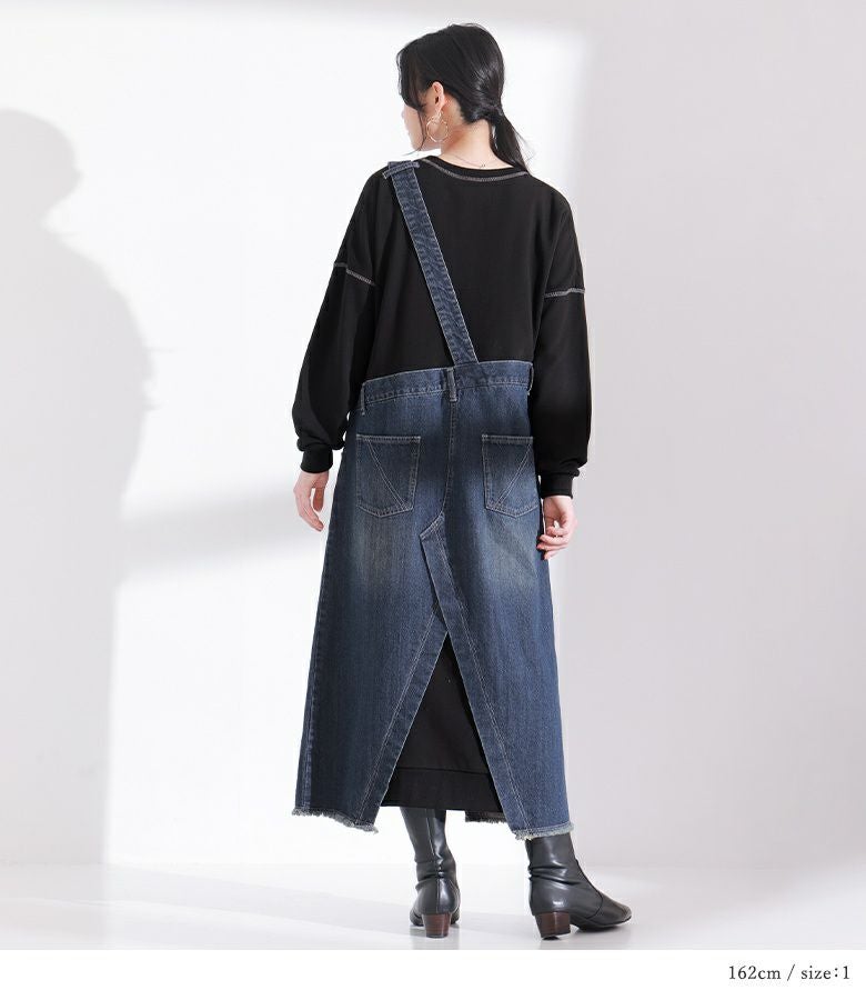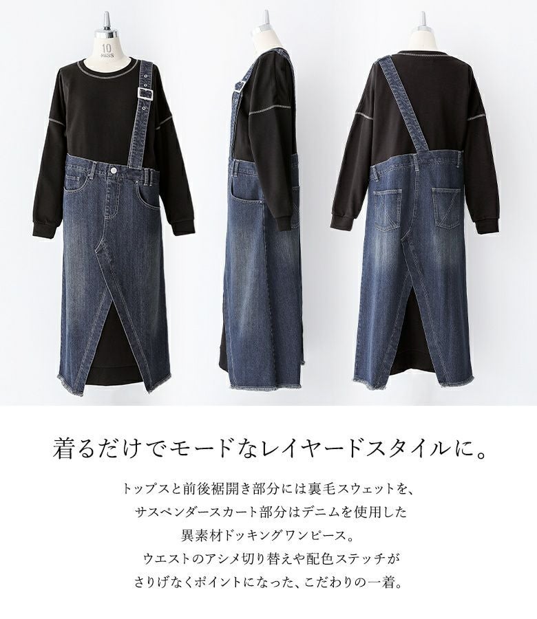トップスと前後裾開き部分には裏毛スウェットを、サスペンダースカート部分はデニムを使用した異素材ドッキングワンピース。