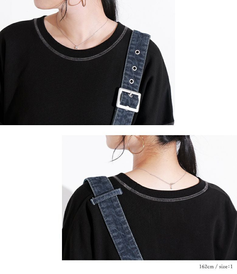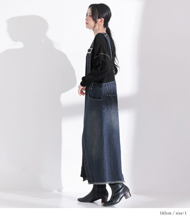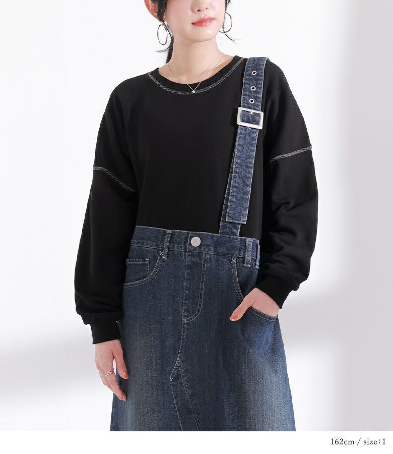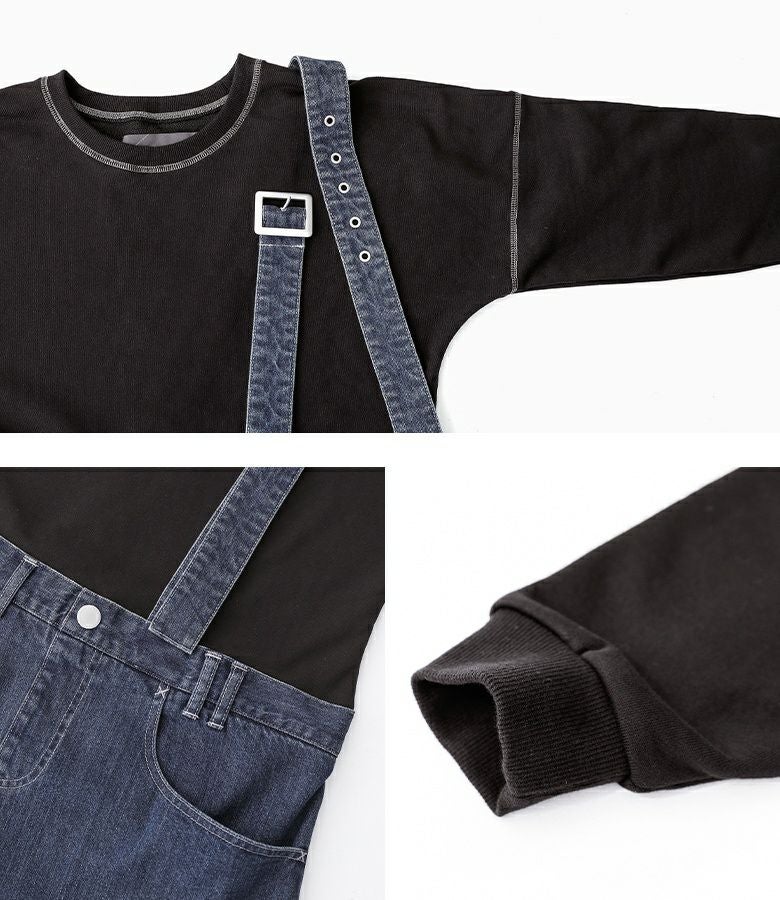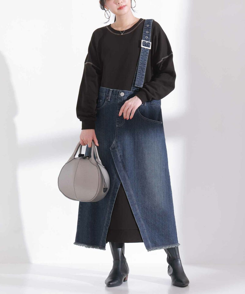トップスと前後裾開き部分には裏毛スウェットを、サスペンダースカート部分はデニムを使用した異素材ドッキングワンピース。