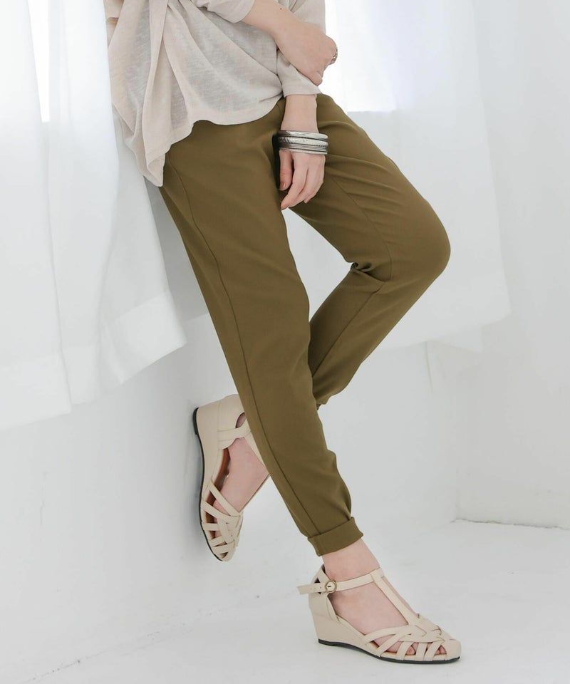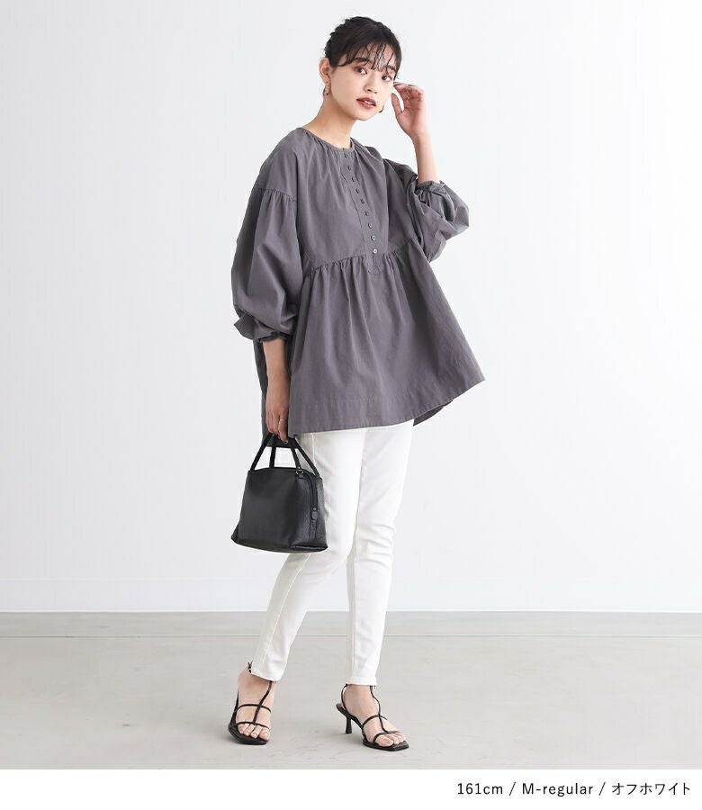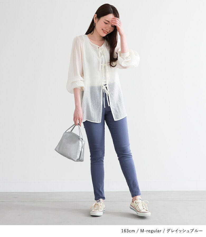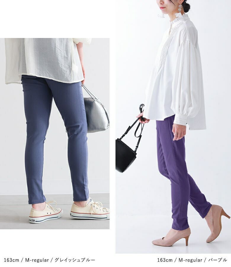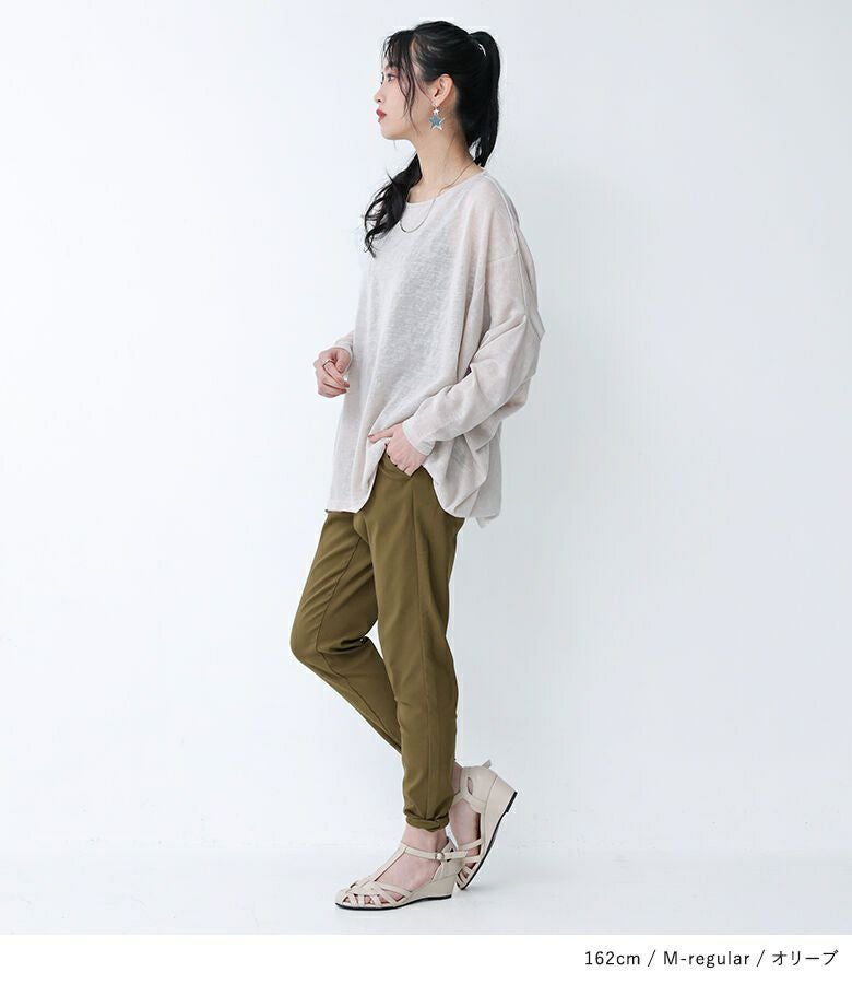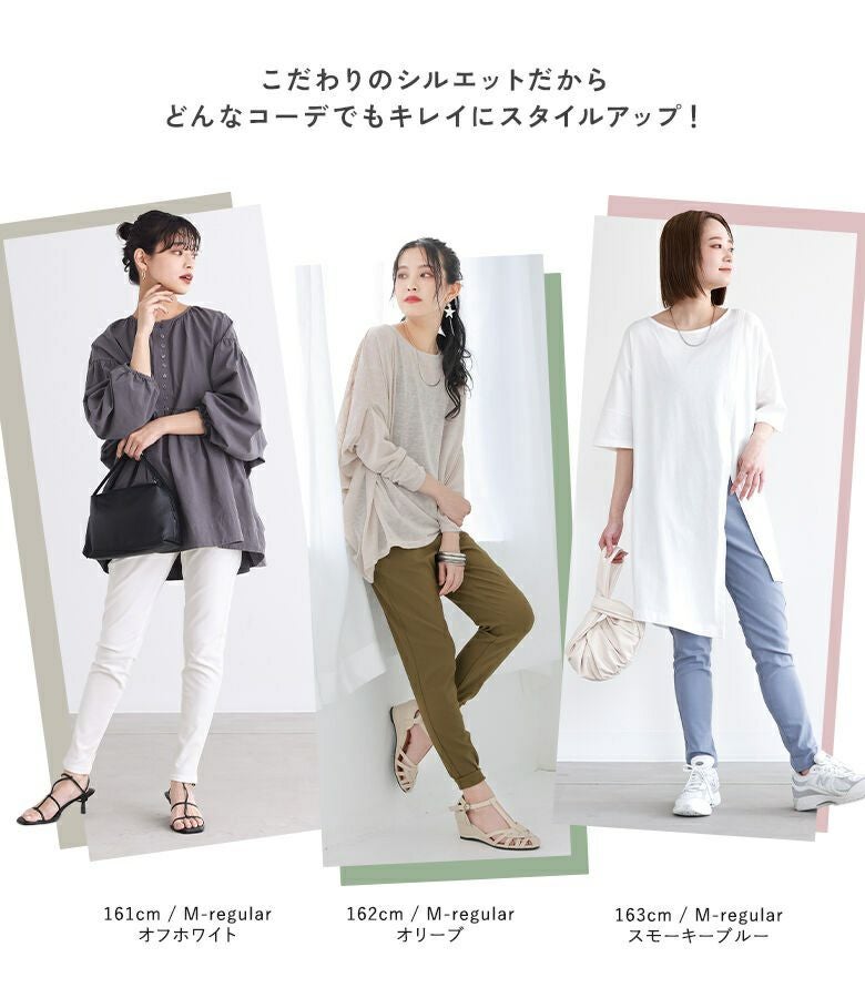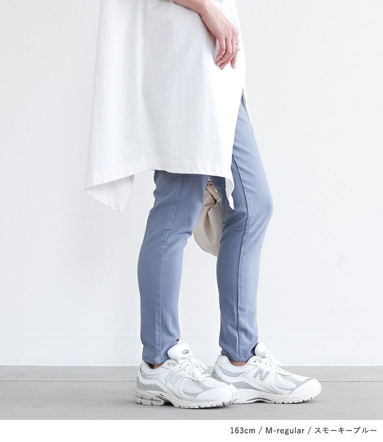 Sサイズは窮屈感はありませんが、足のラインが出るフィット感でした。Mサイズは程よいサイズ感で、スキニーっぽく穿けました。Lサイズは全体的にゆとりがあり、ロールアップやヒール合わせなどで調節して穿きたいです。