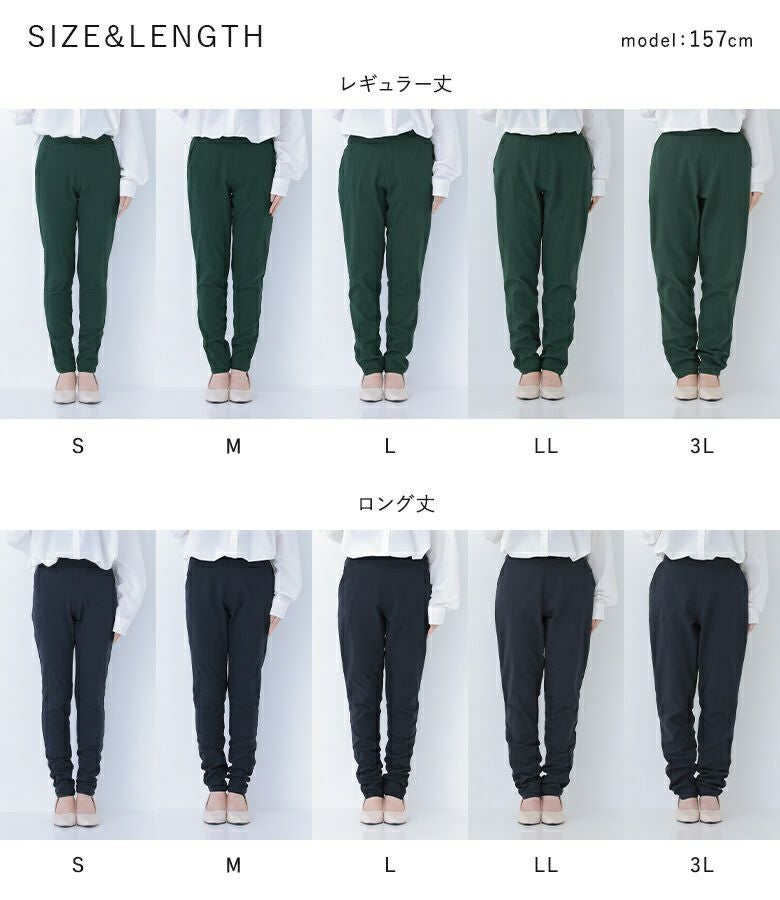 Lサイズは窮屈感はありませんが、ぴったりとしたフィット感がありました。LLサイズは程よいゆとりと綺麗なシルエットで穿けました。3Lサイズは全体的にラフな印象になりました。