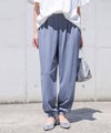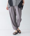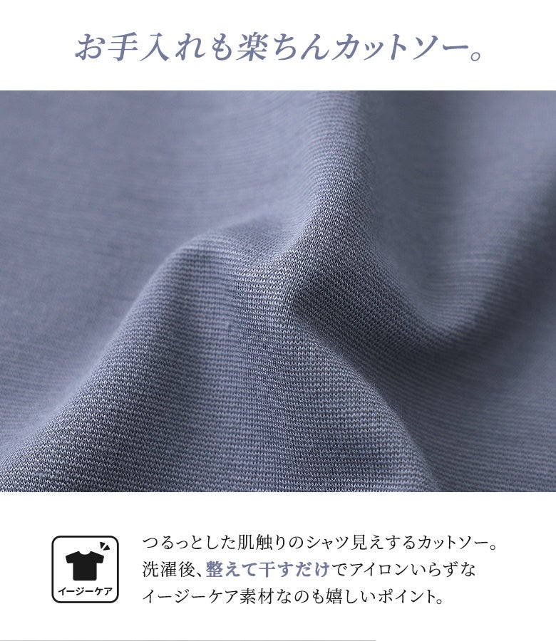 キレイめな印象で落ち感のある、つるっとした肌触りのカットソー生地。ストレッチ性があるので、ノンストレスな穿き心地です。洗濯後、整えて干すだけでアイロンいらずなイージーケア素材です。また、触れた瞬間ひんやり冷たく感じる接触冷感機能付きで、暑い季節を快適に過ごせる生地感です。