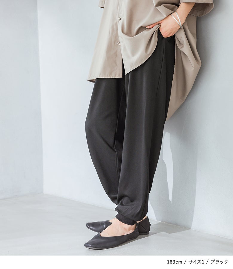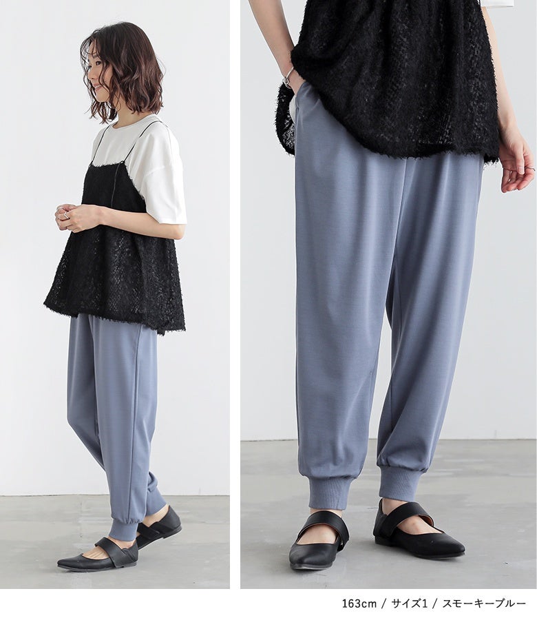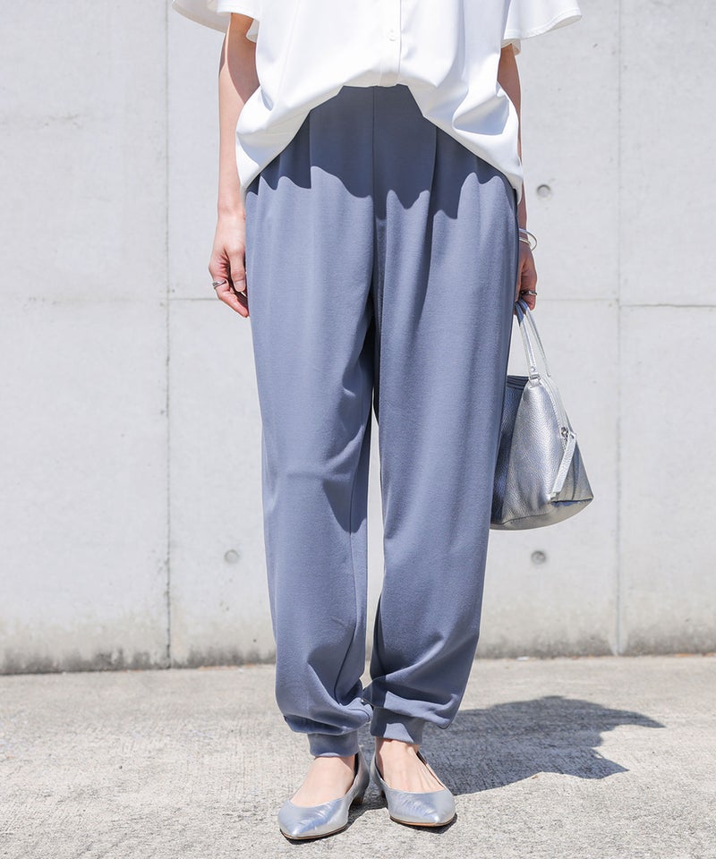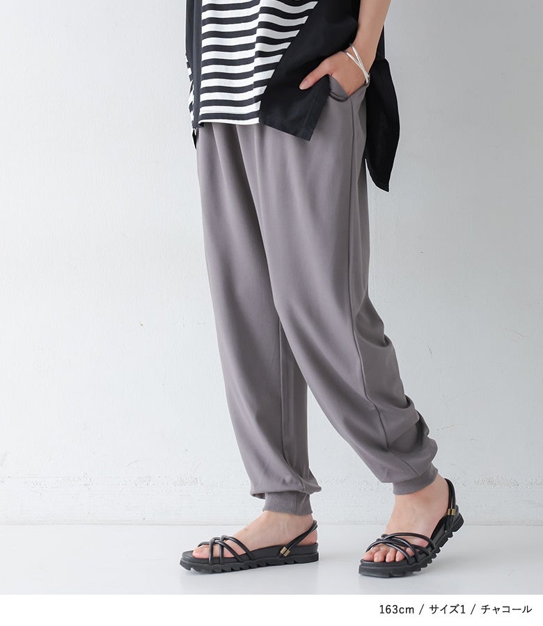 ヒンヤリしていてるので真夏でも穿きやすく重宝します。少し光沢があるのでジョガーパンツですが上品に見えると思います。